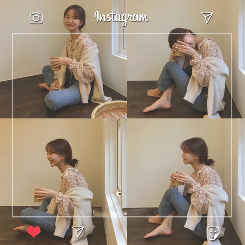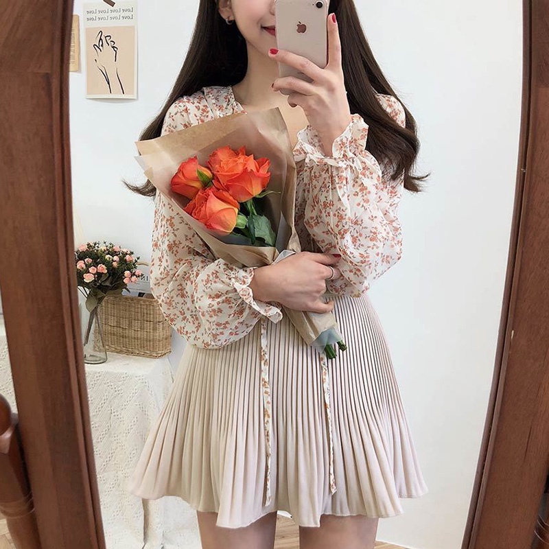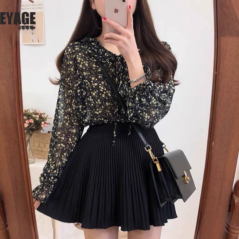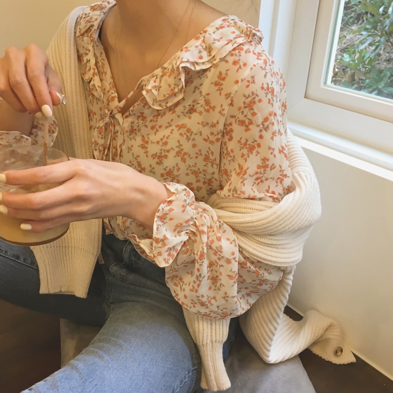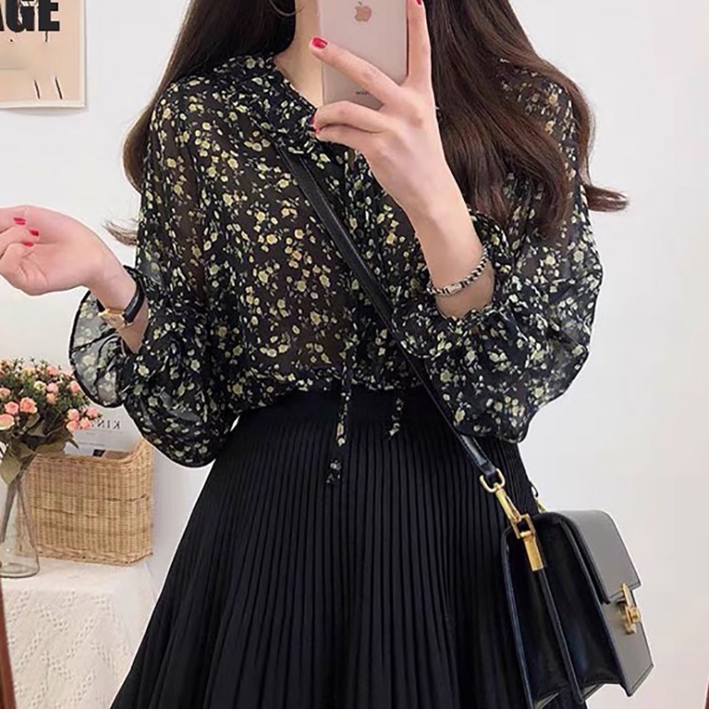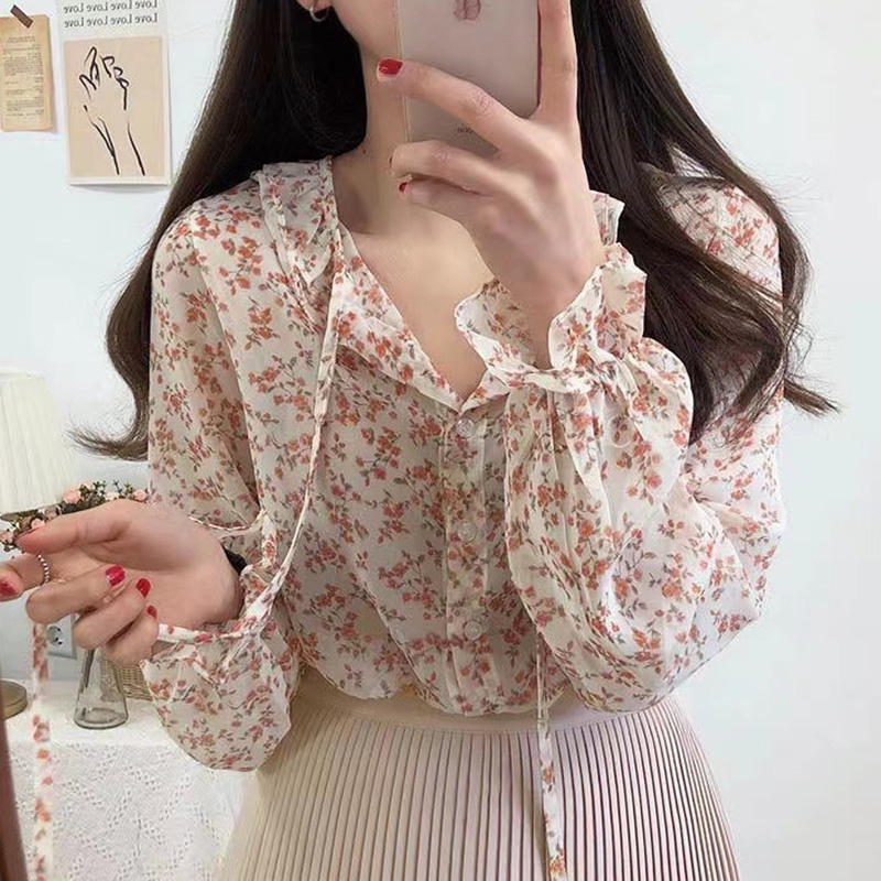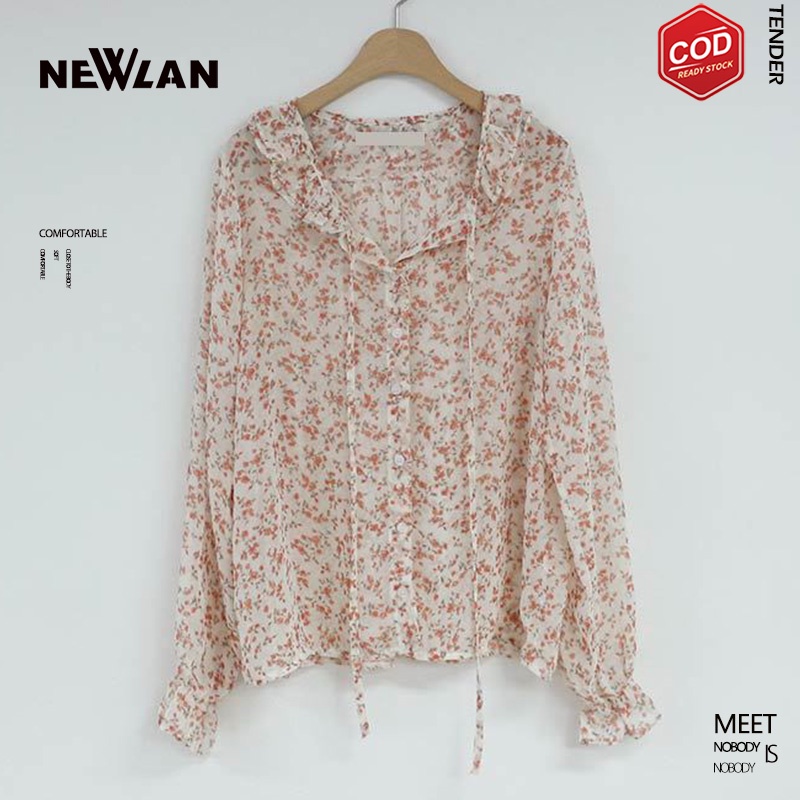 Newlan XF008 Kemeja Sifon Blouse Wanita Korea Blouse Sifon Lengan Panjang Blus Wanita Musim Panas Casual Blouse Motif Bunga Kemeja
