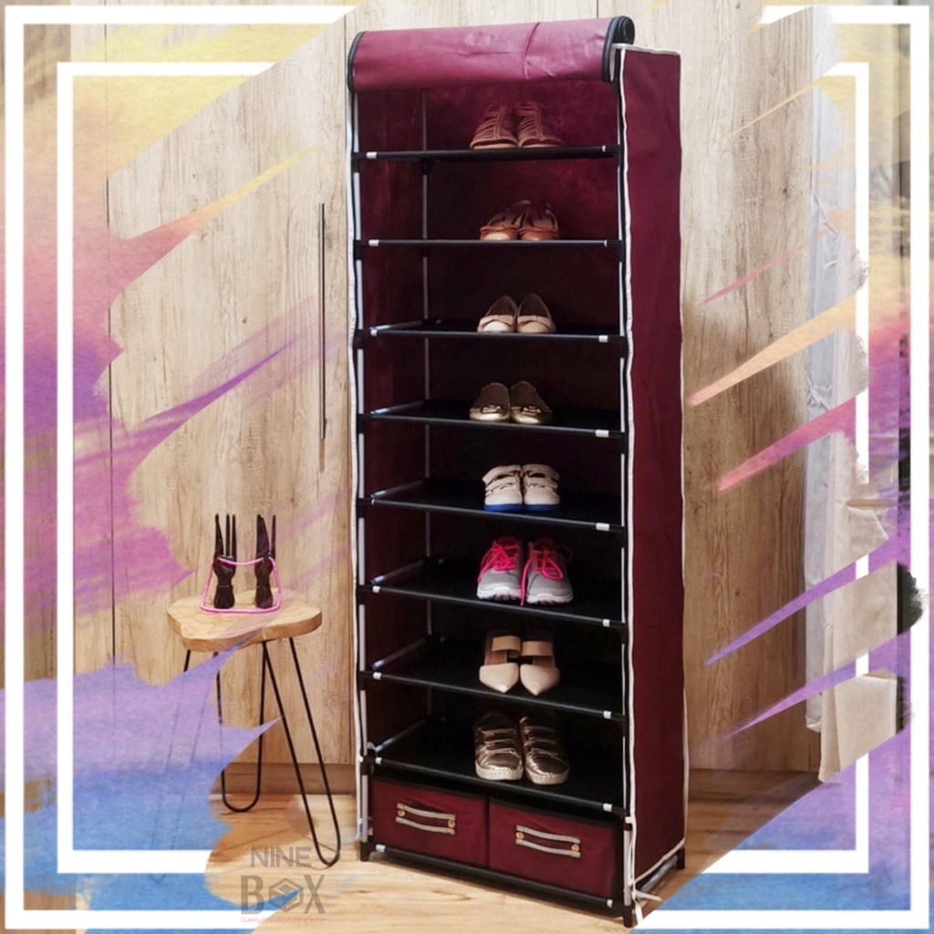 Nine Box rak sepatu kain minimalis 9 susun dengan 2 laci / rak sepatu anti debu / lemari sepatu