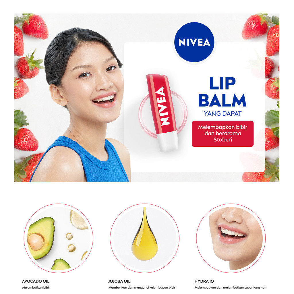 Nivea Caring Lip Balm Strawberry Shine 4.8Gr | 24h Melt In Moisture | Merah Jingga Official