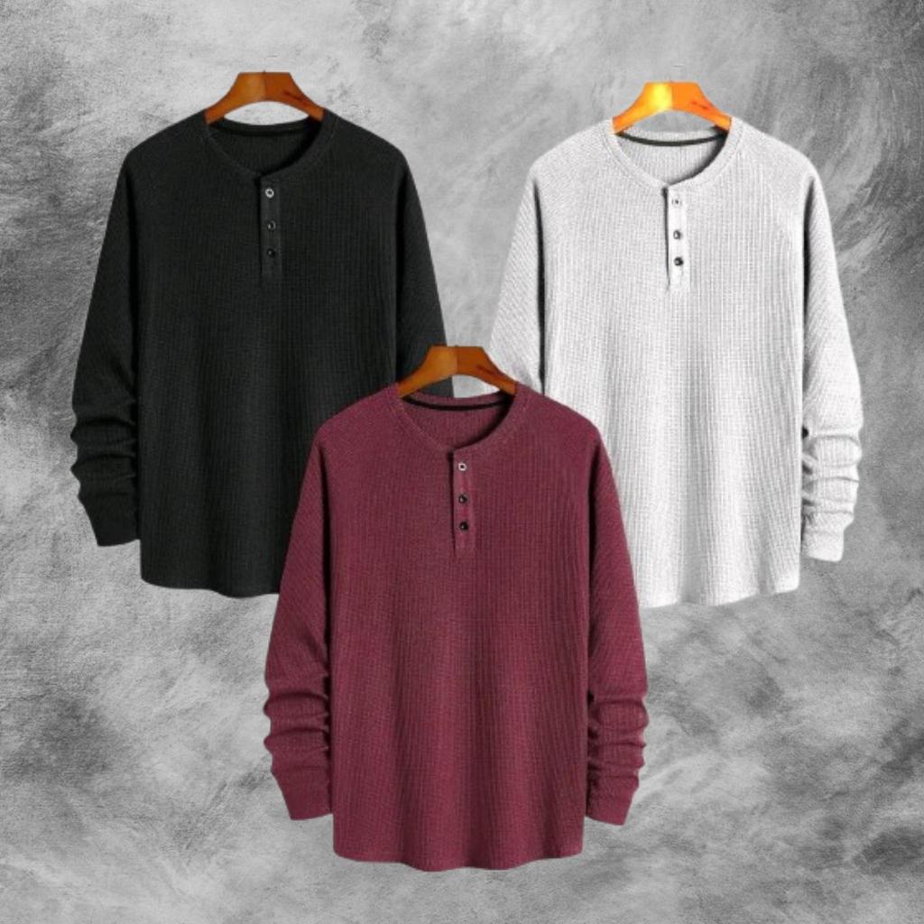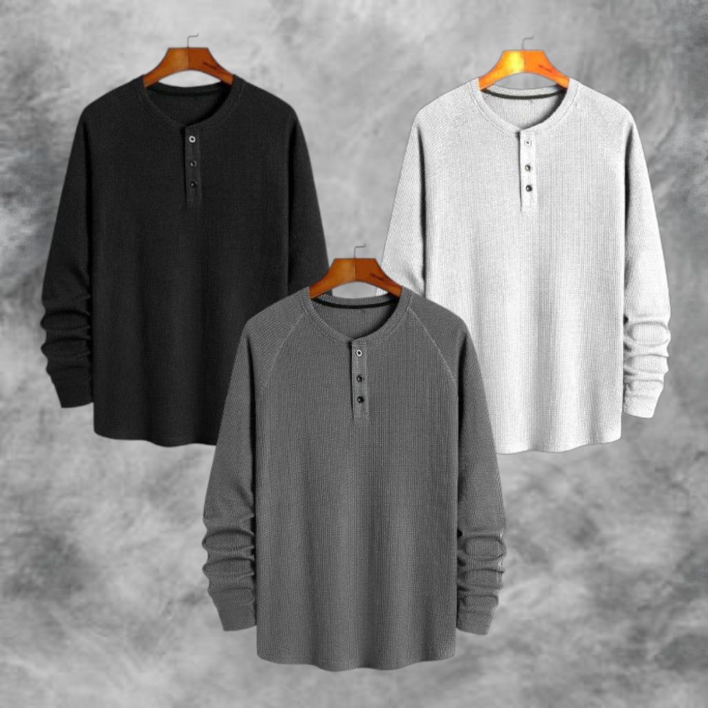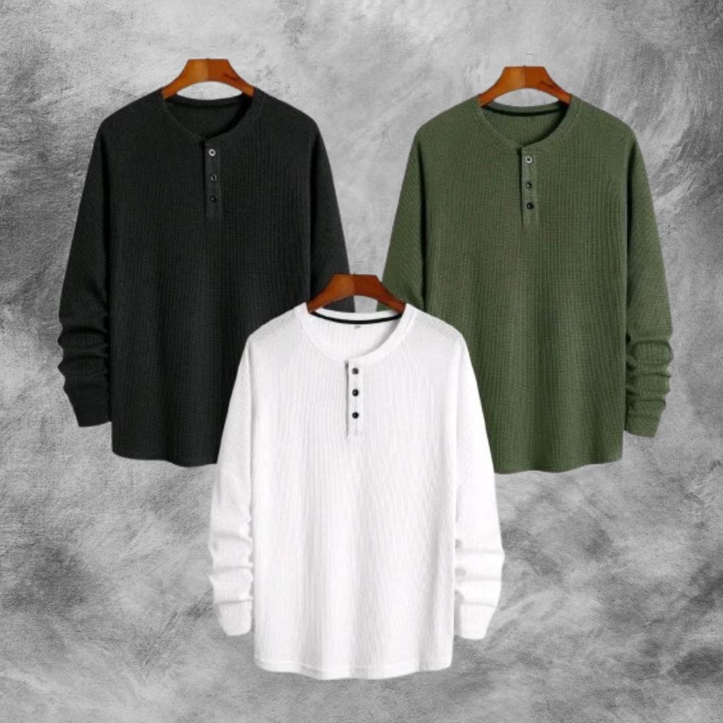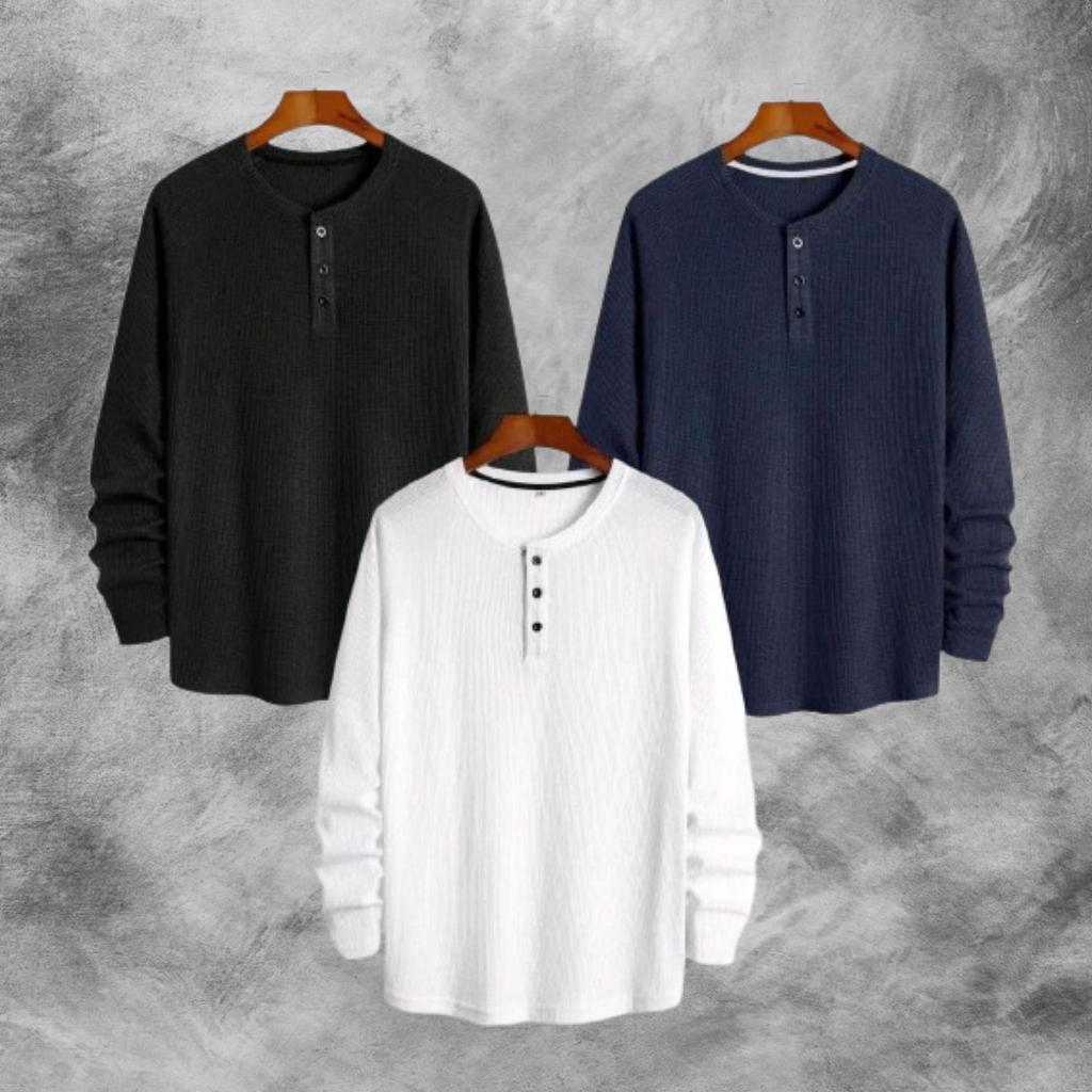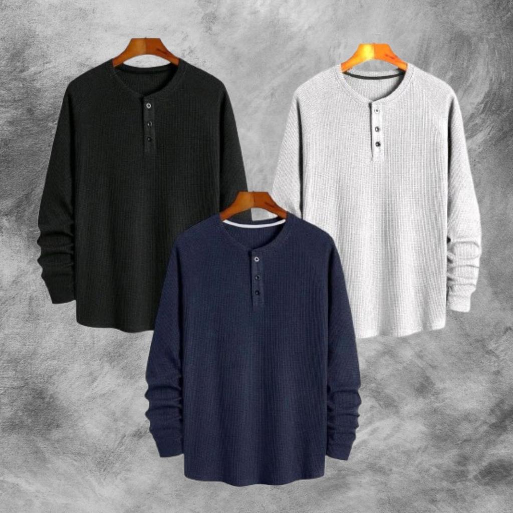 PAKET HEMAT 3 PCS KAOS KNIT WAFFLE POLOS LENGAN PANJANG PREMIUM | KNIT KAOS WAFFLE KANCING LENGAN PANJANG | STYLE KOREAN TERLARIS