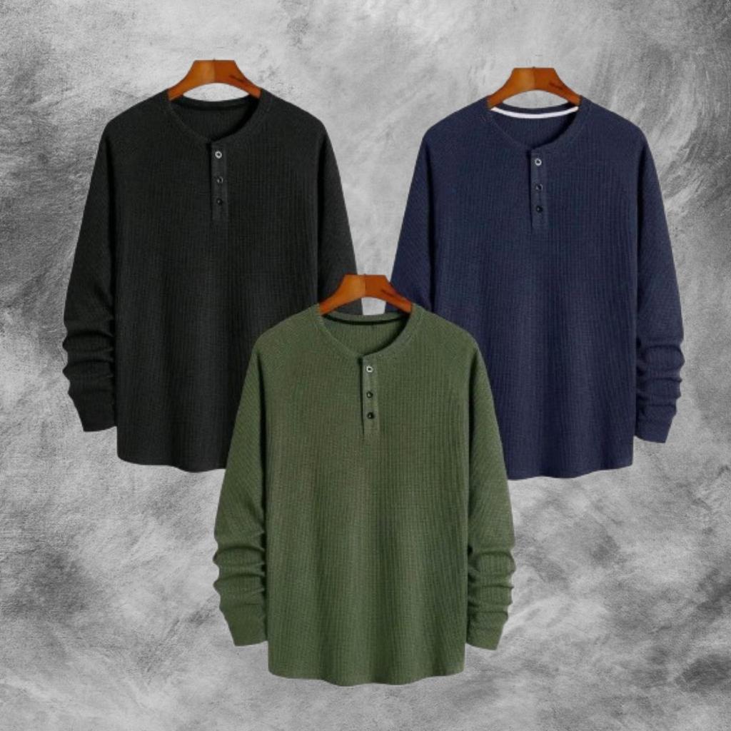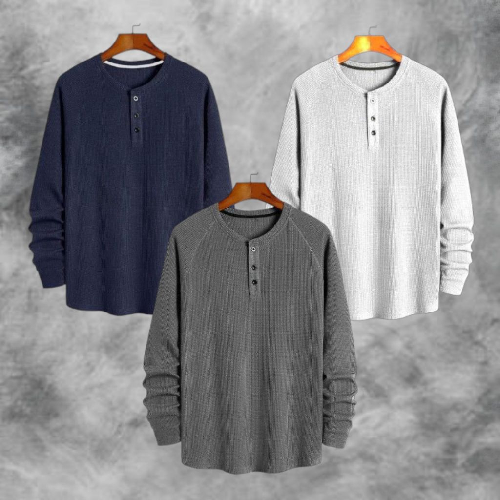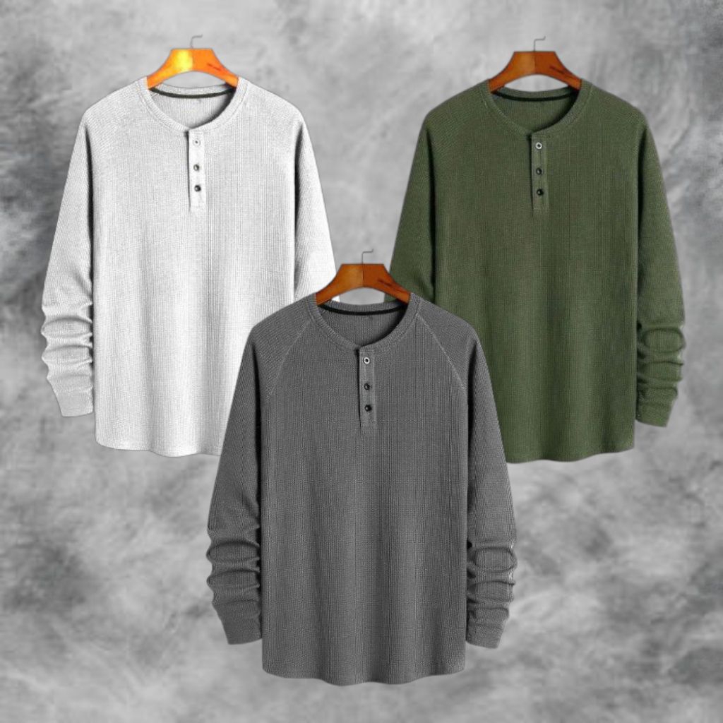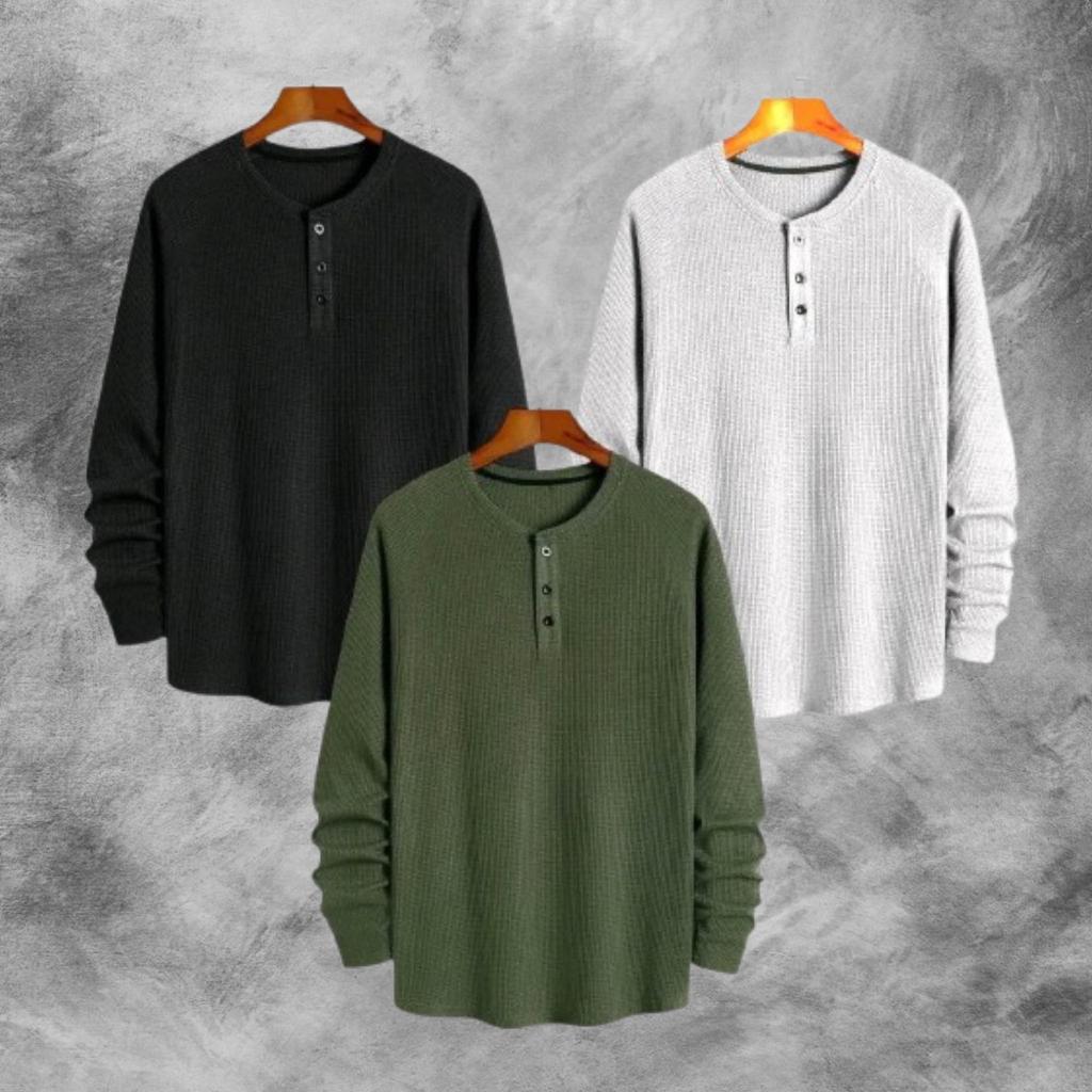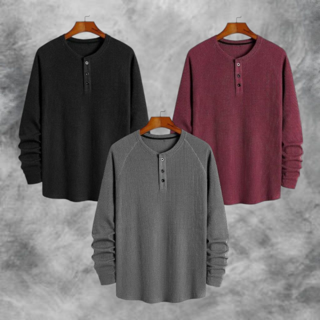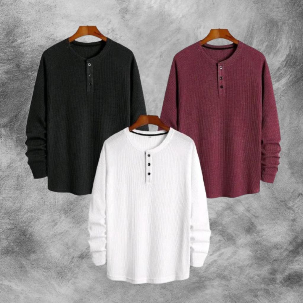 PAKET HEMAT 3 PCS KAOS KNIT WAFFLE POLOS LENGAN PANJANG PREMIUM | KNIT KAOS WAFFLE KANCING LENGAN PANJANG | STYLE KOREAN TERLARIS