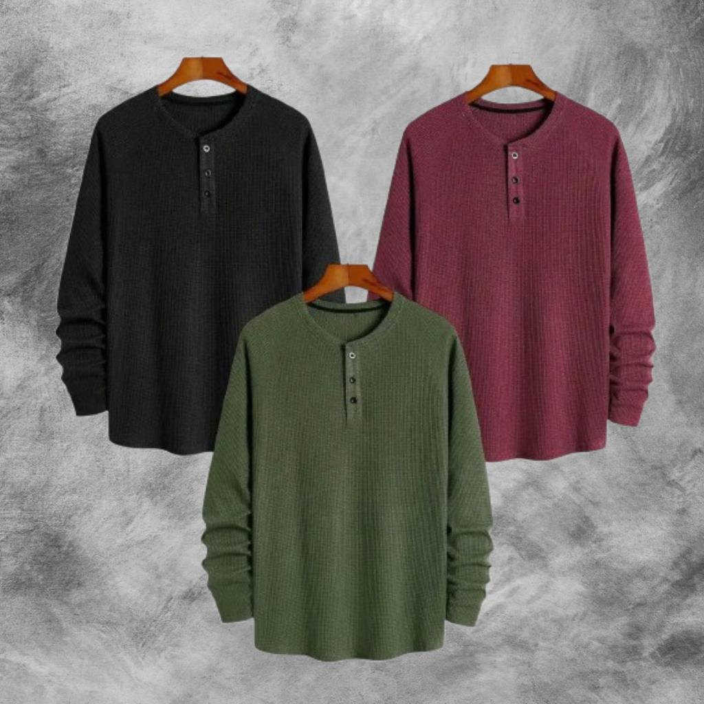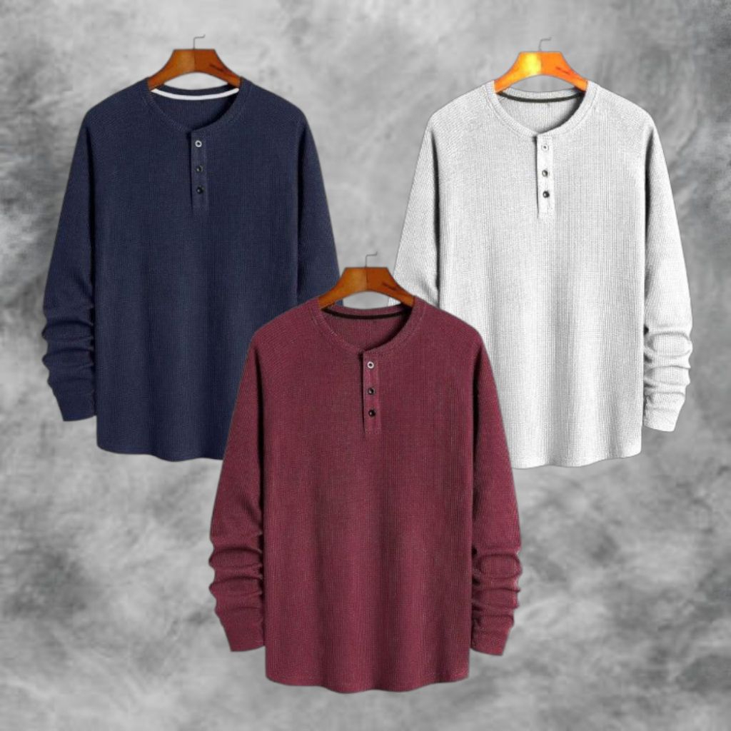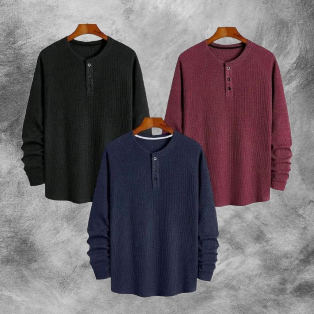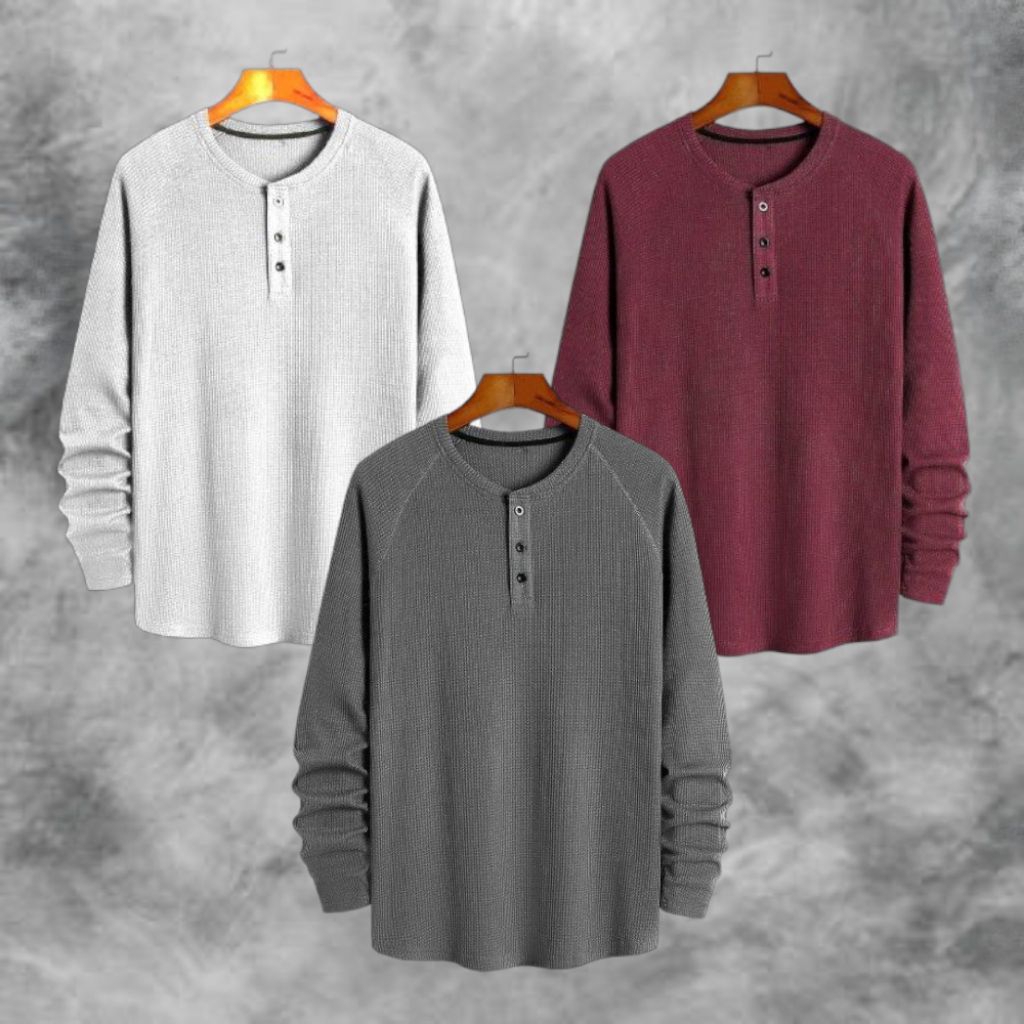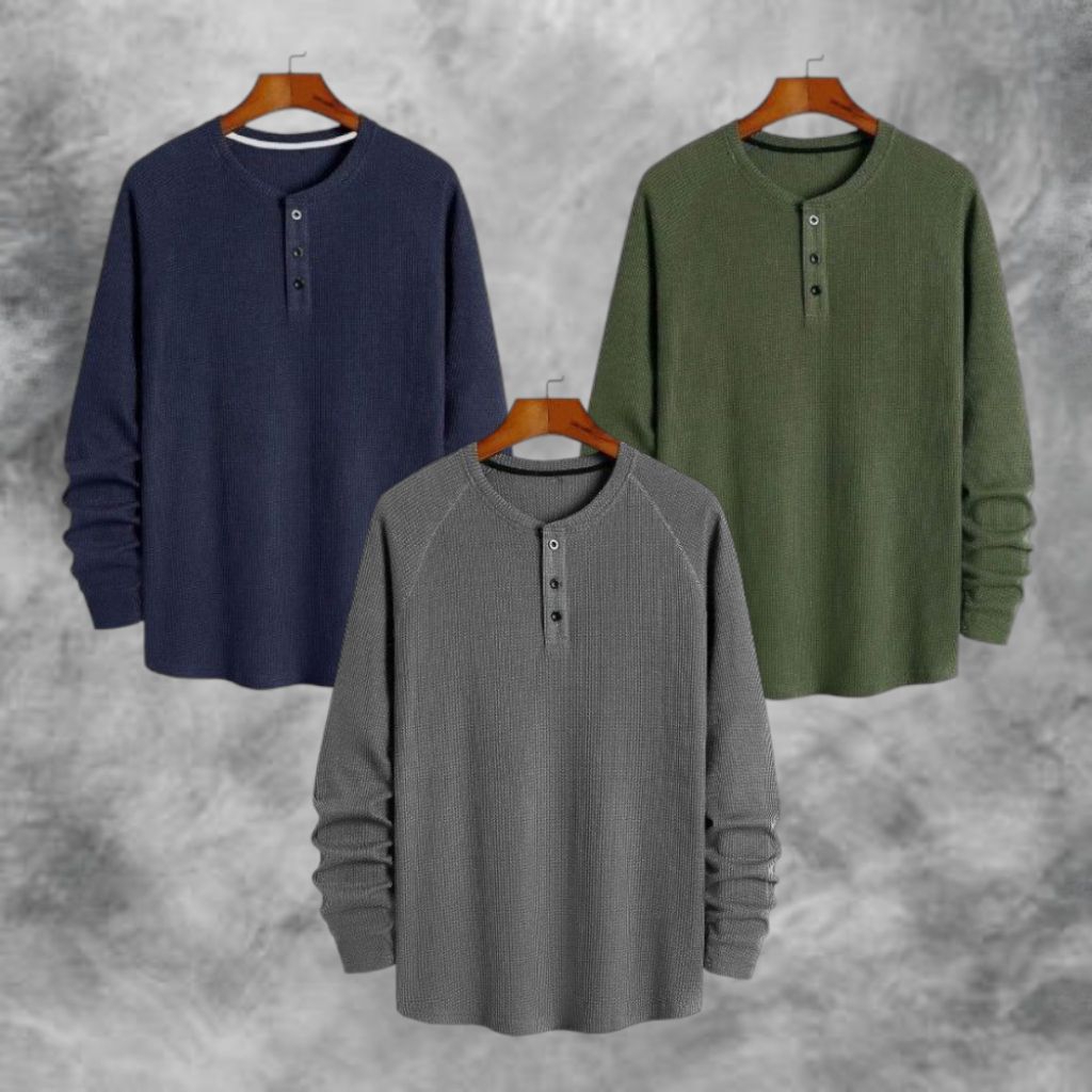 PAKET HEMAT 3 PCS KAOS KNIT WAFFLE POLOS LENGAN PANJANG PREMIUM | KNIT KAOS WAFFLE KANCING LENGAN PANJANG | STYLE KOREAN TERLARIS