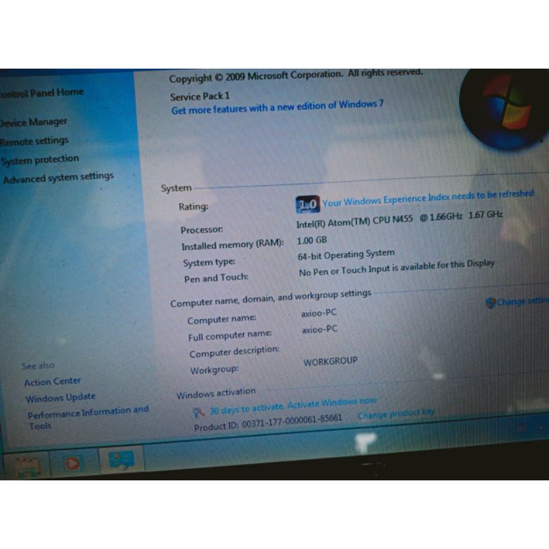 Notebook Axioo M1110 Ram 1gb HDD 250gb intel Atom