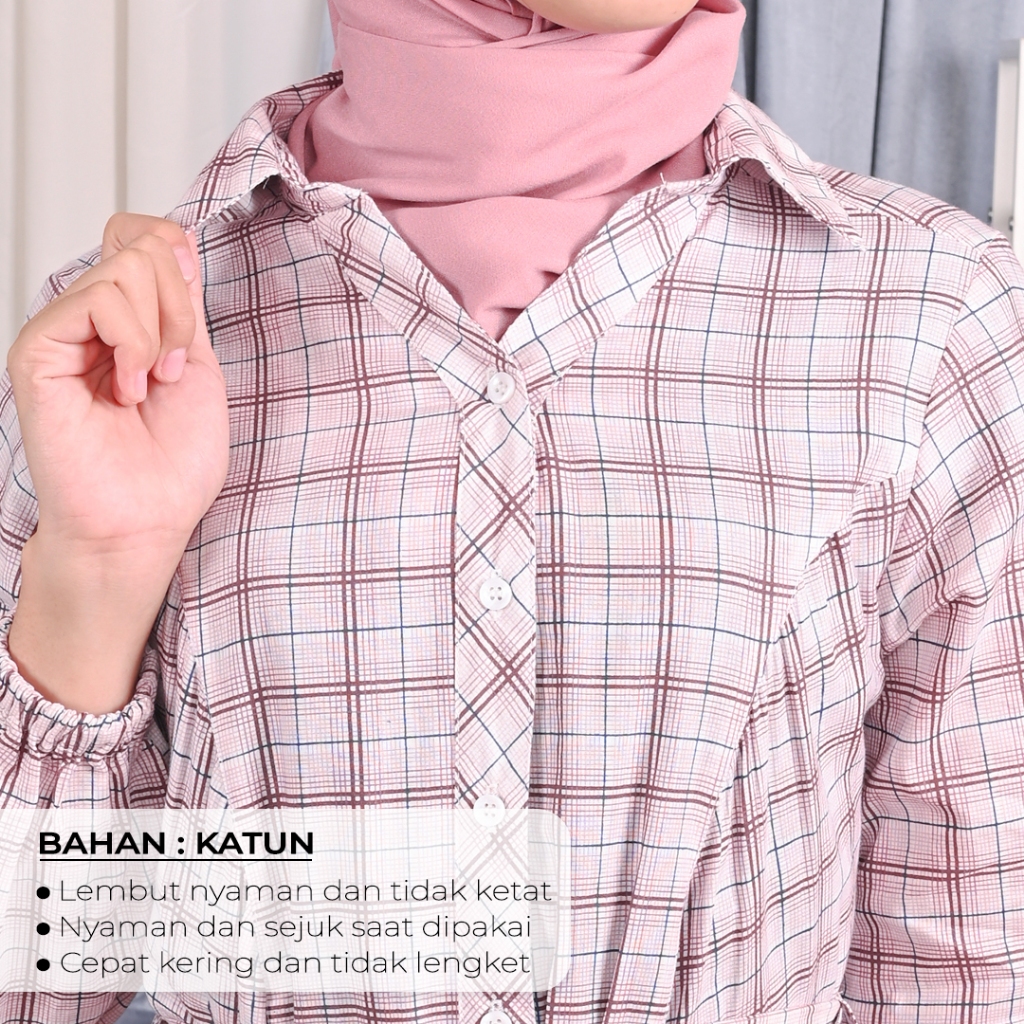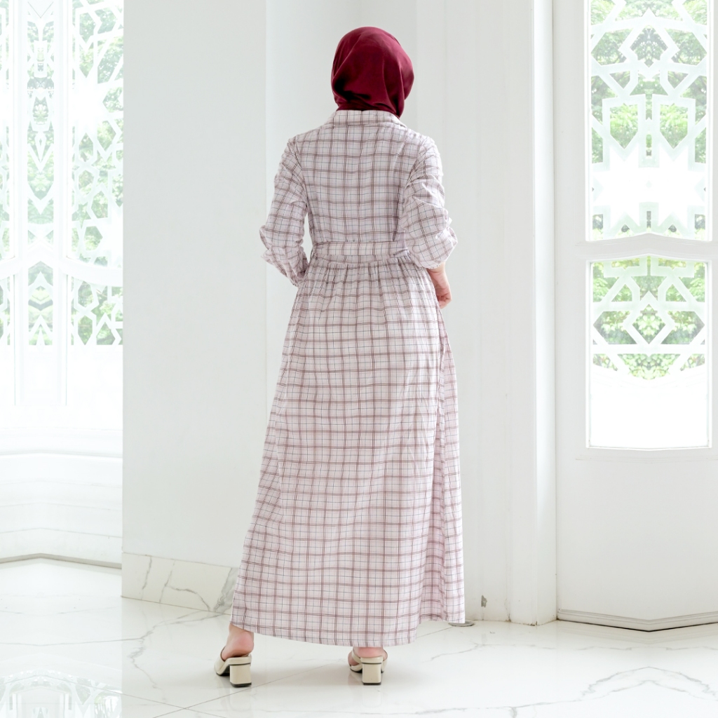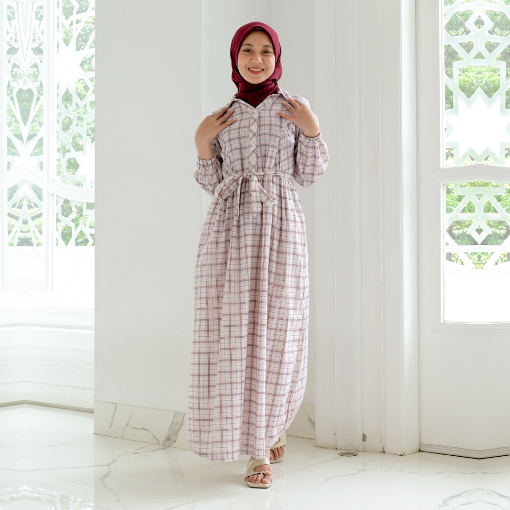 Novel Mice | Gamis Wanita Katun Plaid Pink | Dress Wanita Lengan Panjang Motif Kotak