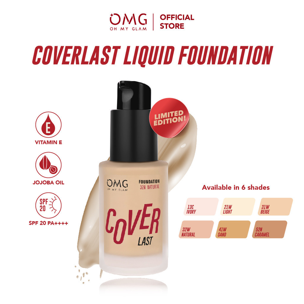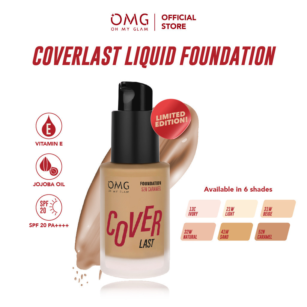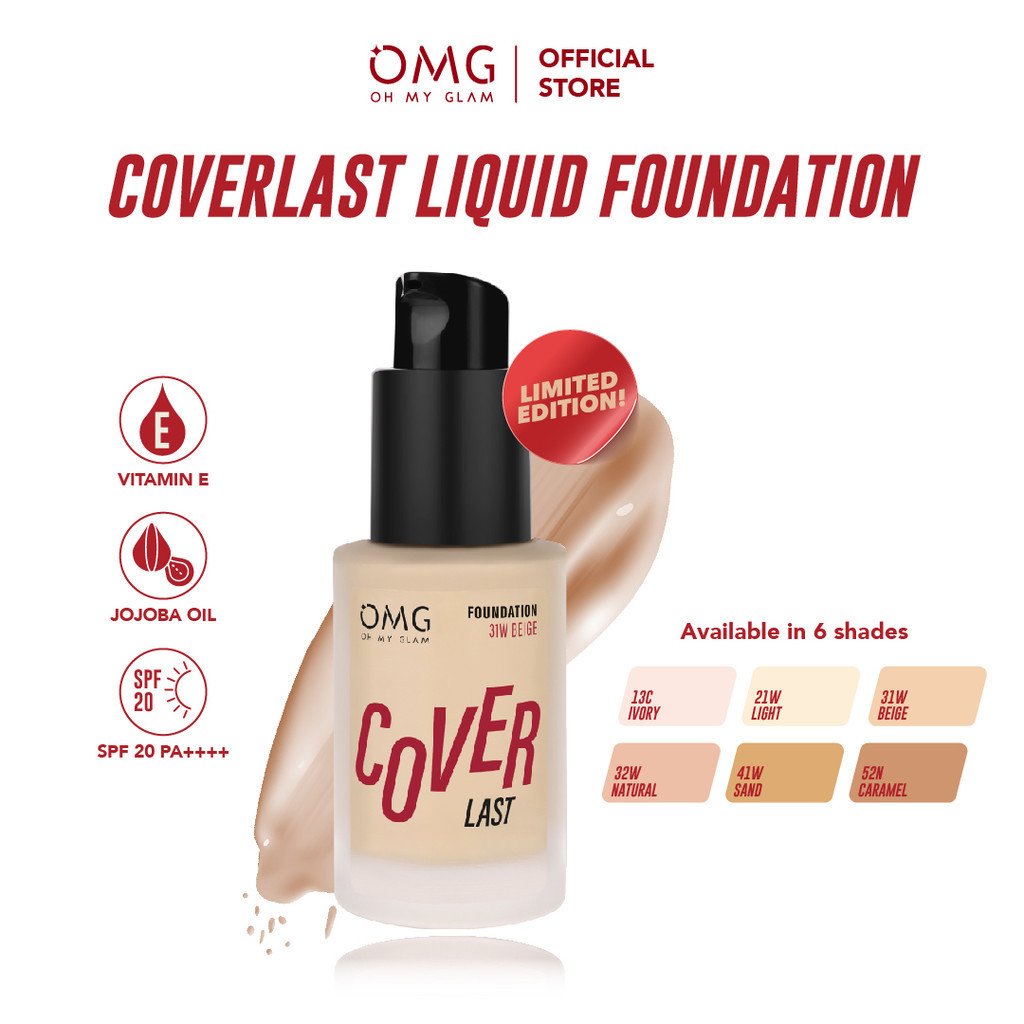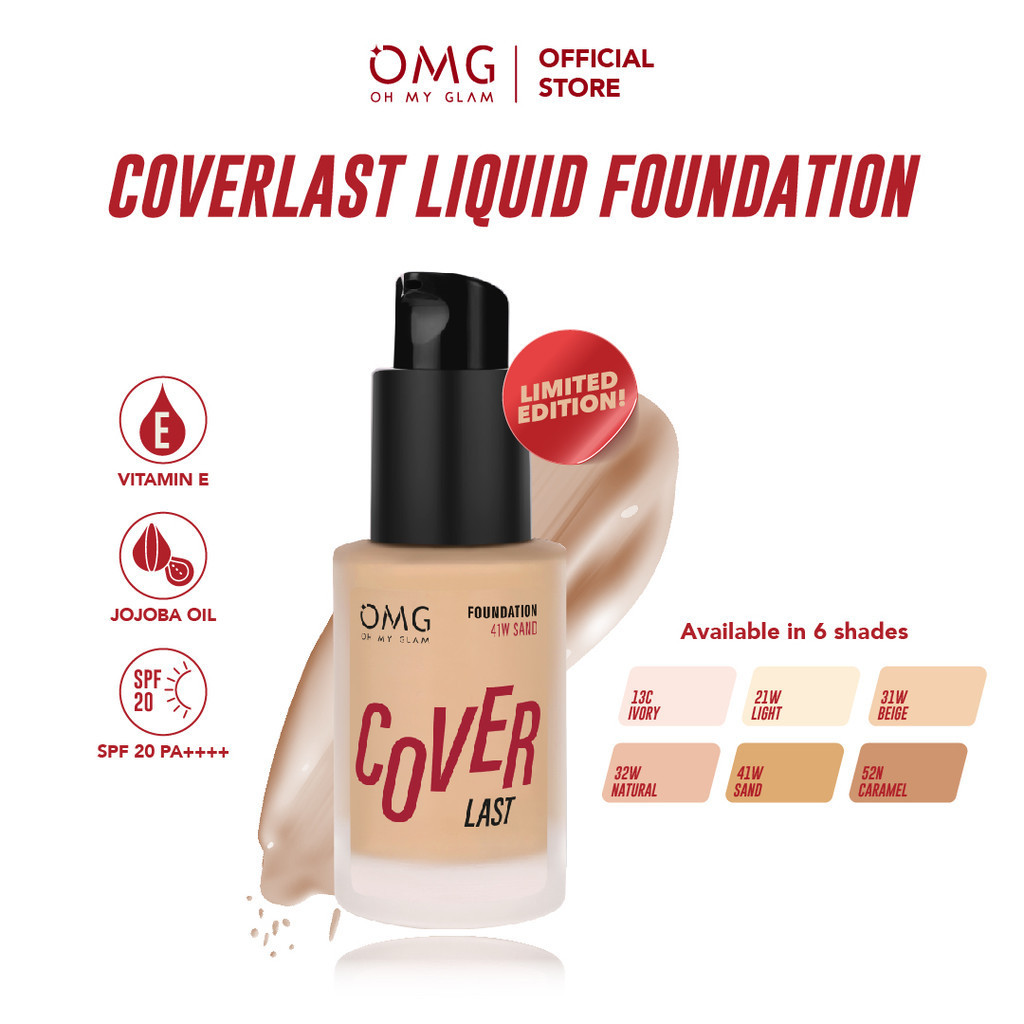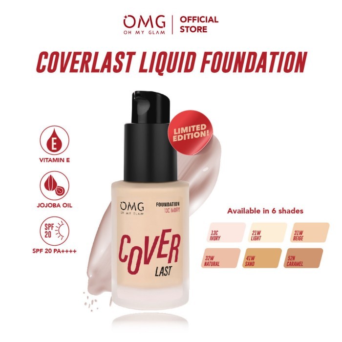 OMG Oh My Glam Coverlast Liquid Foundation 15 ml - Alas Bedak Ringan - Liquid Foundation Make Up High Coverage Tahan Lama 8 Jam - Menyamarkan Pori, Oil Control, Melindungi dari UVA/UVB SPF 20 PA++