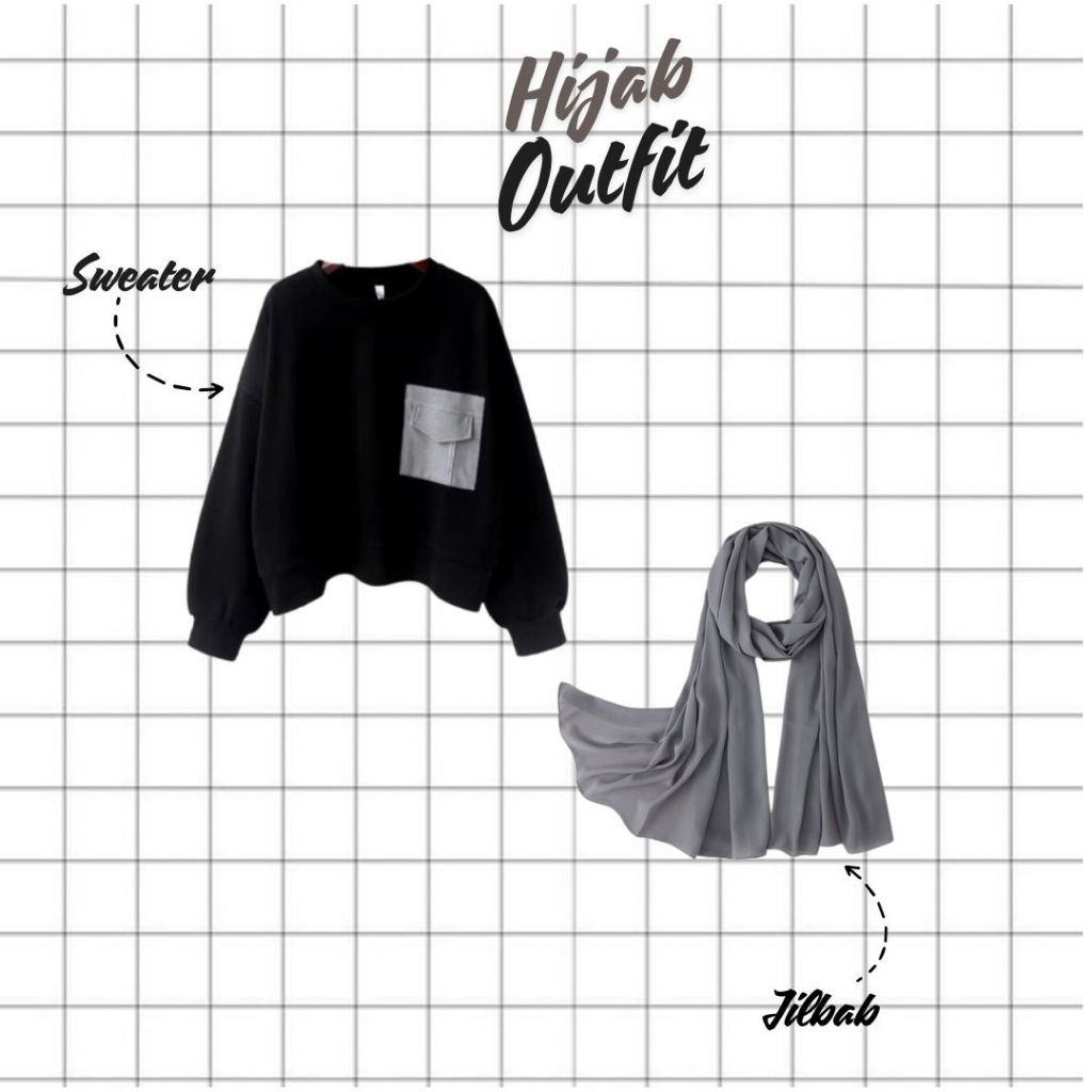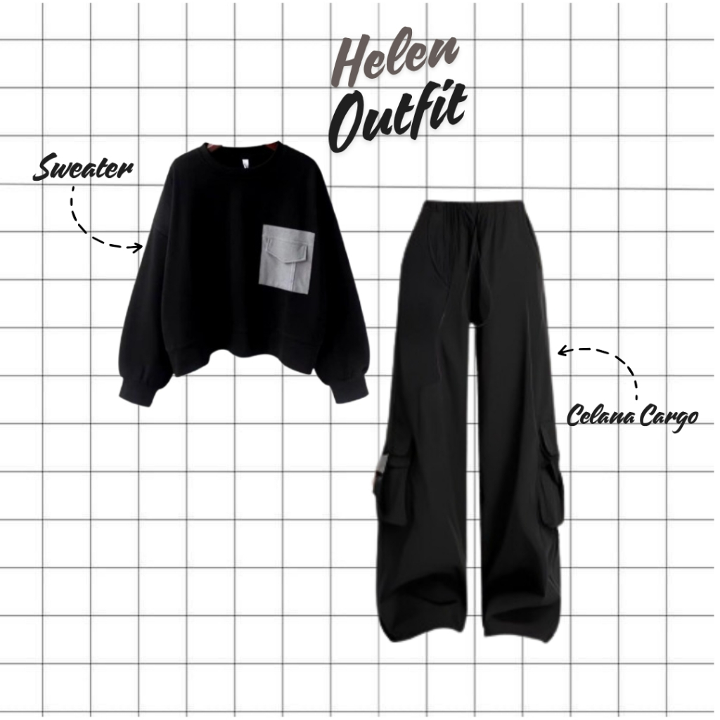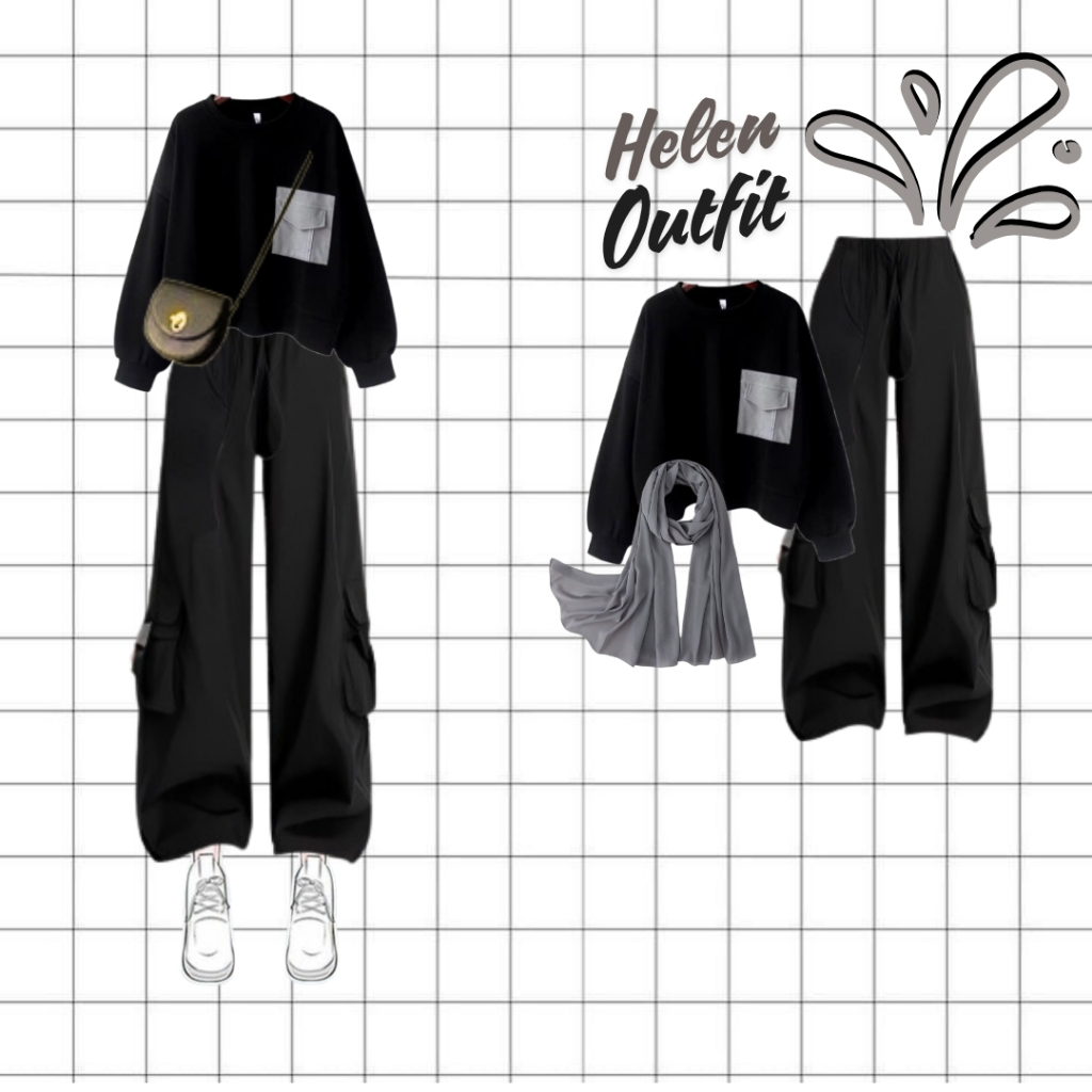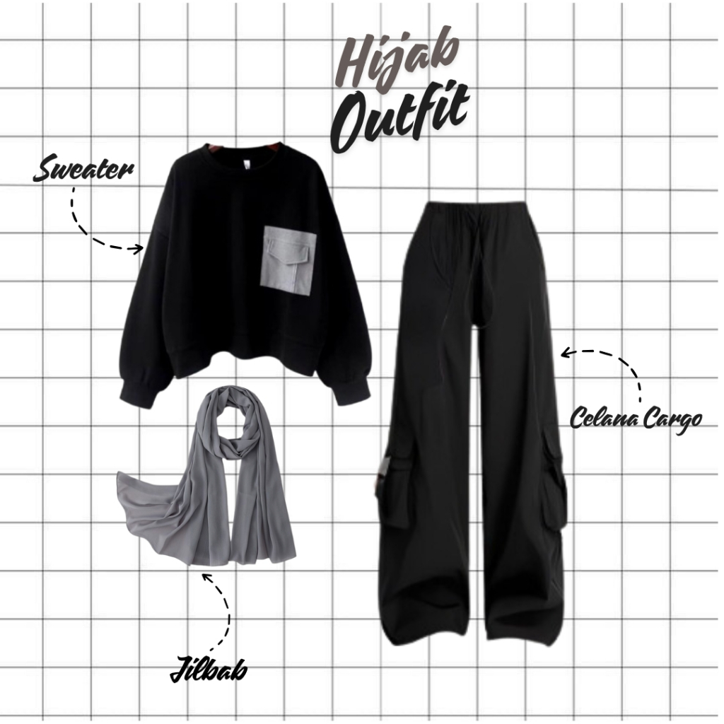 OOTD Skena Helen Outfit ( Sweater + Celana Cargo + Jilbab ) Setelan One Set Keren Kekinian