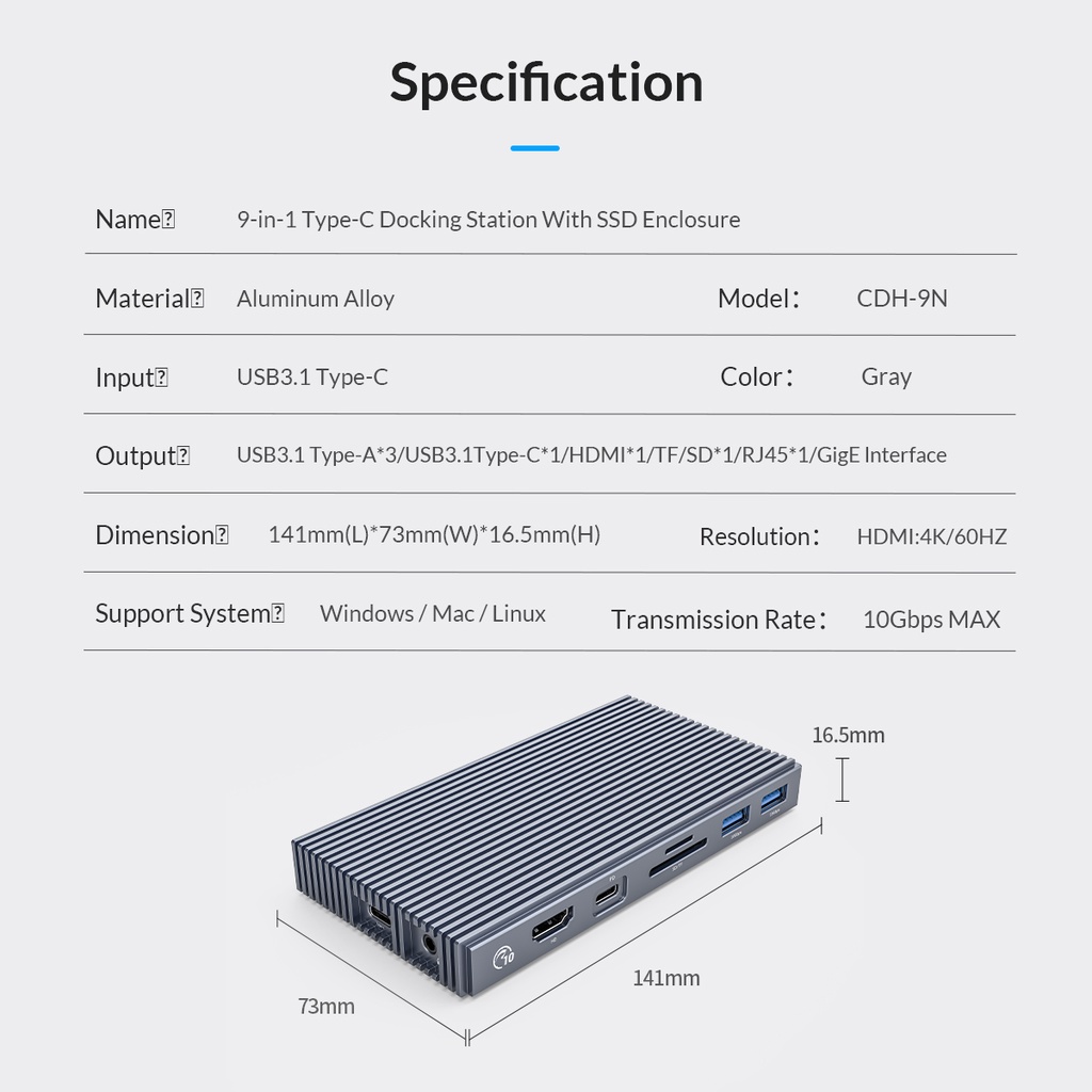 ORICO 9in1 Type C Hub NVME Enclosure USB 3.1 HDMI TF SD RJ45 - CDH-9N