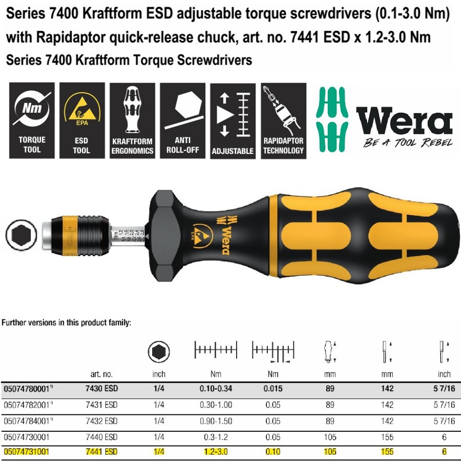 WERA 05074731001 Obeng Torsi ESD 1/4" 1.2-3.0 Nm Adjustable Torque