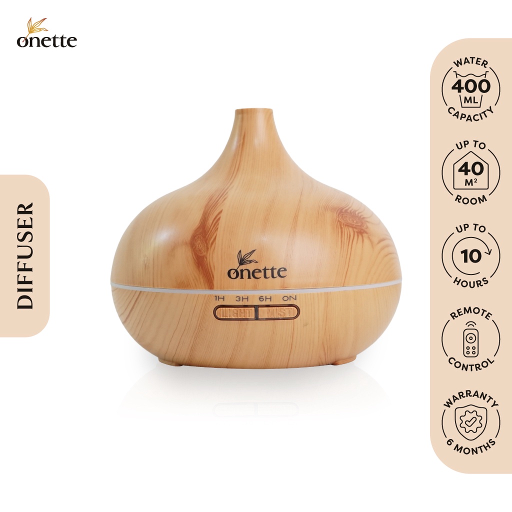 Onette Diffuser Aromatherapy Wooden Capacity 400 ml & Essential Oil Set, Difuser Aromaterapi & Minyak Atsiri Murni - Lavender, Lemongrass & Peppermint EO, Diffuser Kayu, Minyak Esensial Alami