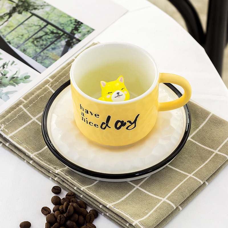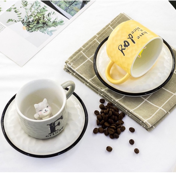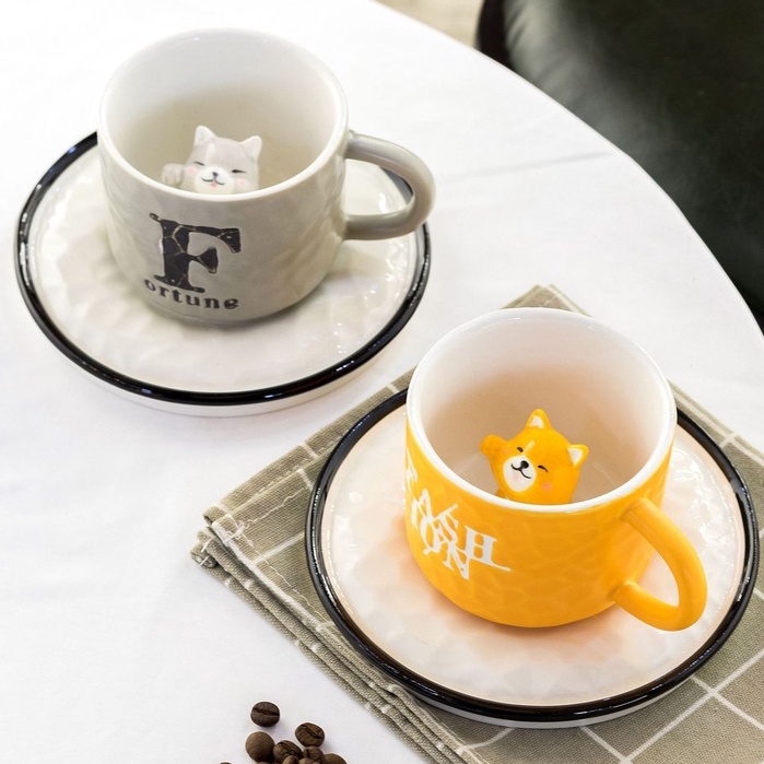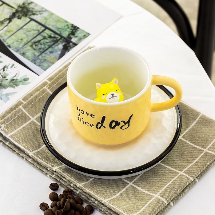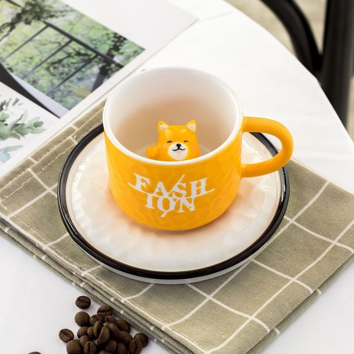 Onsen Dog Mug Cup / Gelas Cangkir Keramik Motif Onsen Anjing Dengan Tatakan Saucer Gelas / Mug Hadiah Kado Gift Ultah Lucu