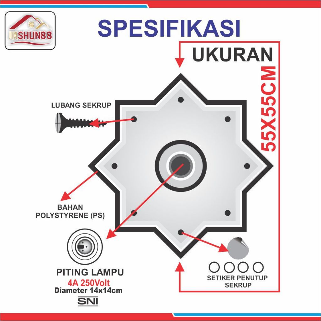 Ornamen Lampu PVC / Ornamen Plafon PVC / Fitting Lampu /Tempat Lampu/Piting Lampu Hias / Rumah Lampu Hias / Lampu Hias Plafon Kaligrafi/ Bola Lampu Hias /Fitting Lampu Plafon Bentuk Bintang Putih Polos BK-825