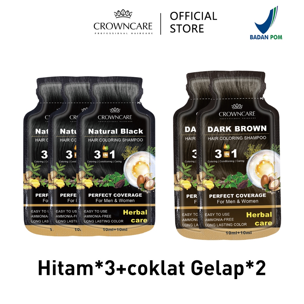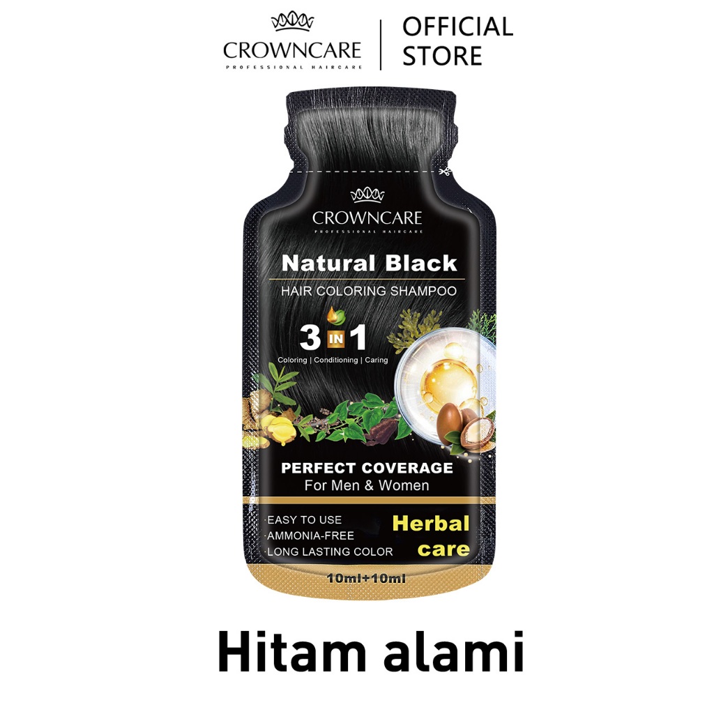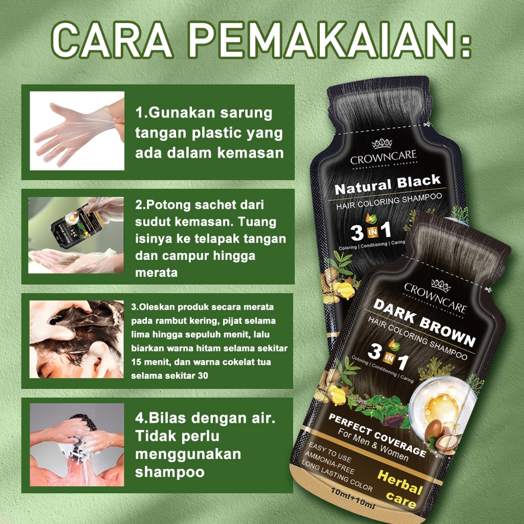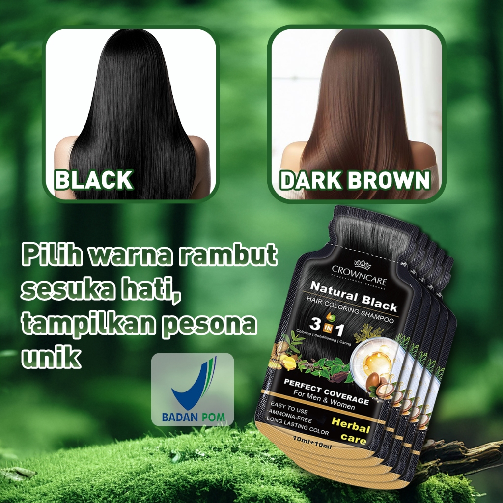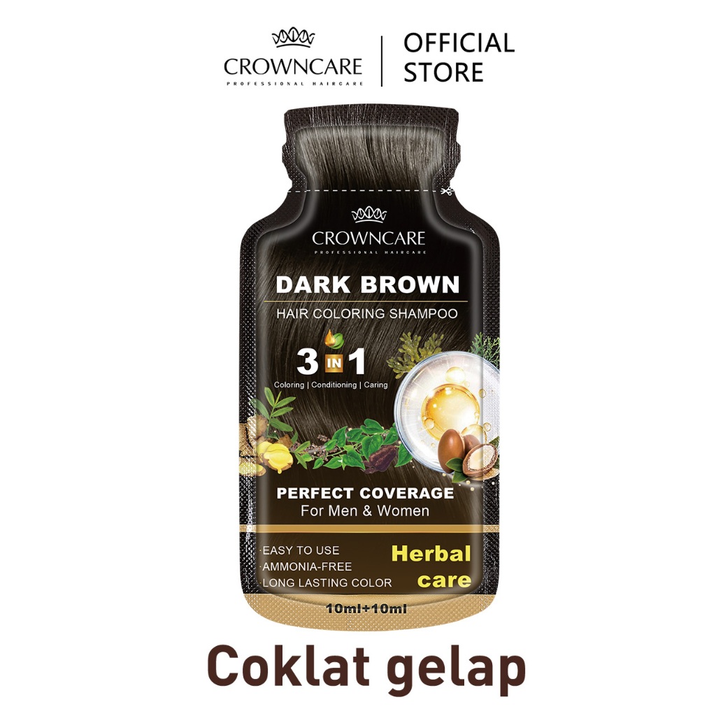 Crowncare Bubble Hair Color Foam Cat Pewarna Rambut | Pewarna Rambut Herbal Tanpa Alergi, Hair Dye - Perawatan /Treatment Rambut Hitam alami & Coklat gelap 20ml/Sachet