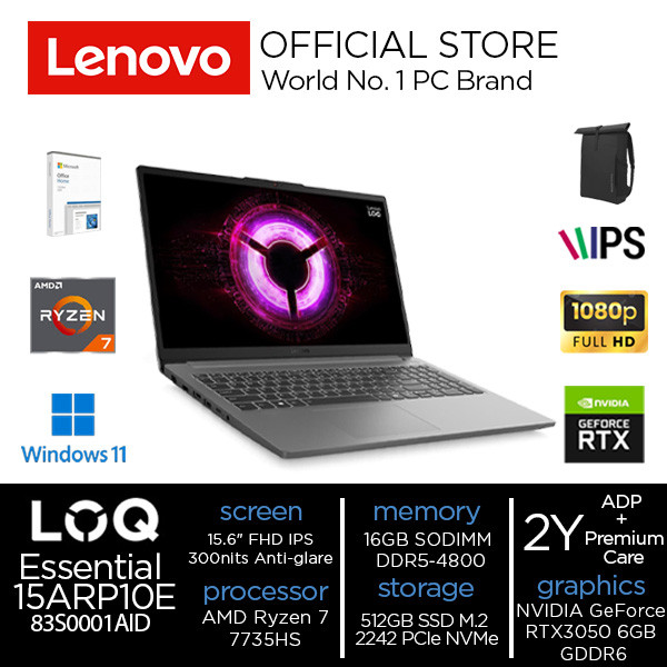 Lenovo LOQ Essential 15ARP10 1AID Ryzen 7 7735HS 16GB 512GB 15.6" RTX3050 W11+M365+OH2024