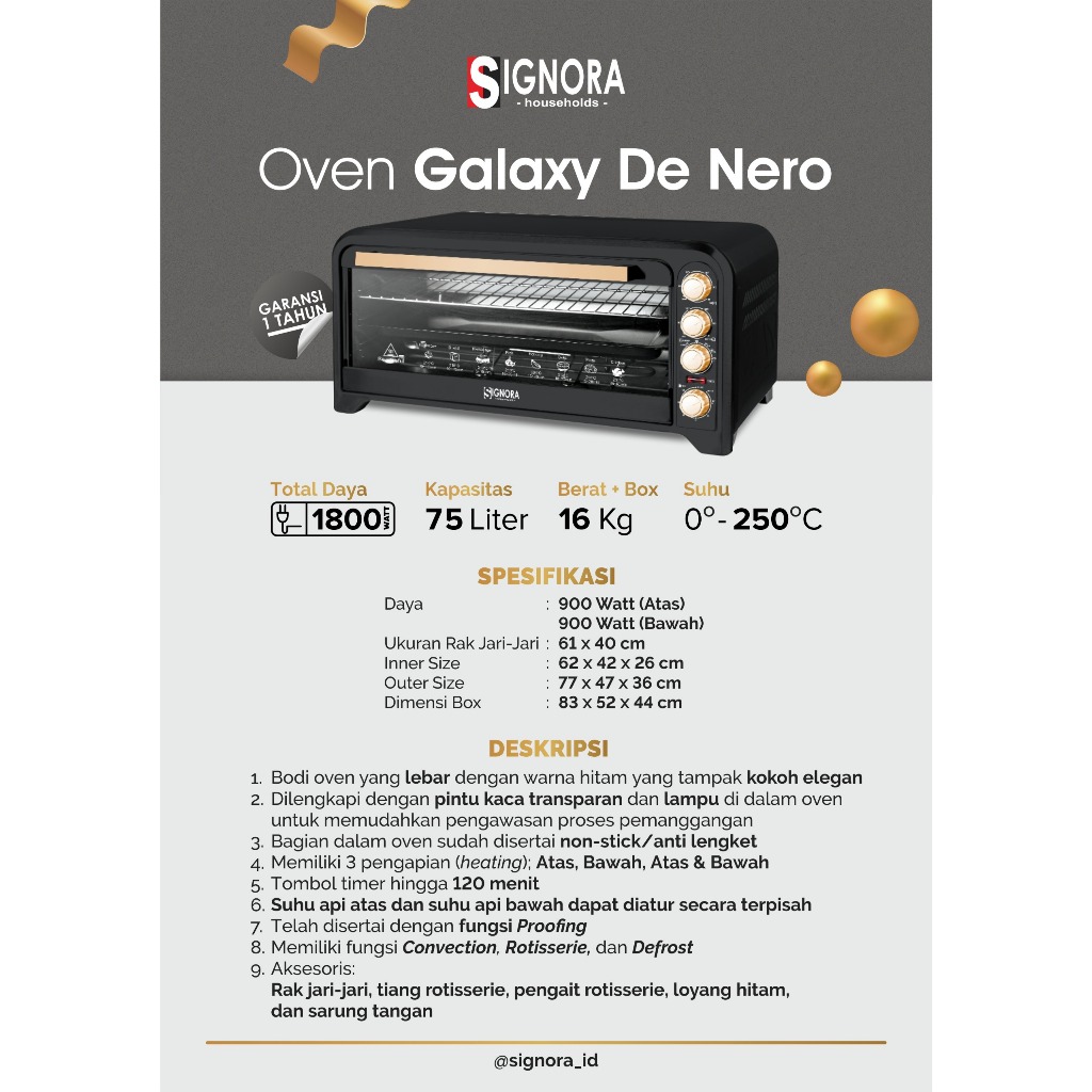 Oven Galaxy DE NERO 75 Liter Signora / Khusus Luar kota atau Luar Pulau