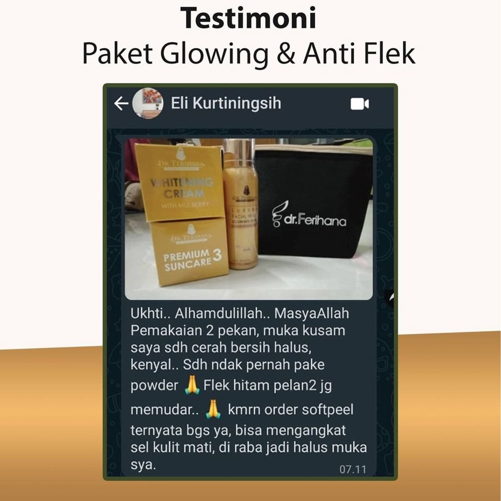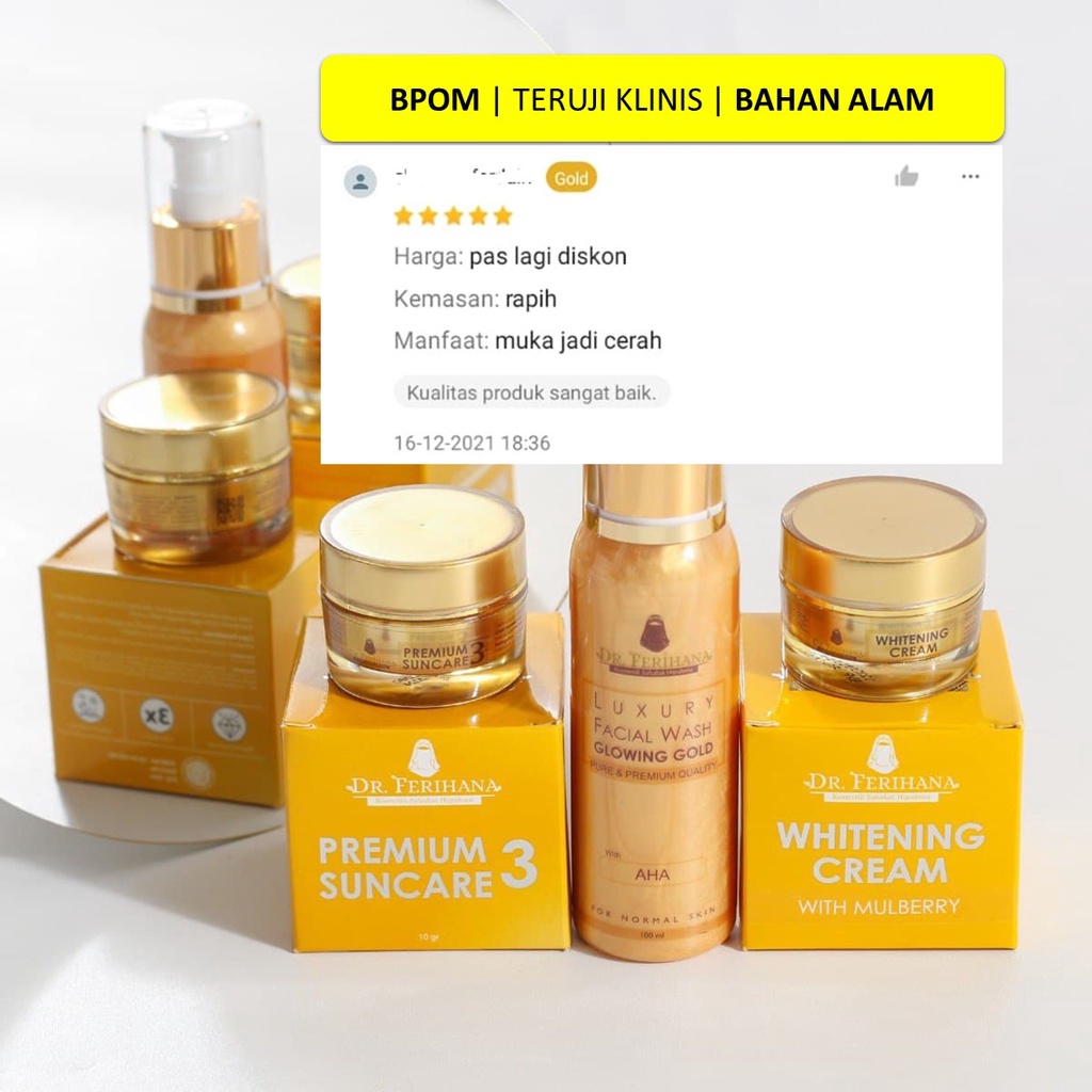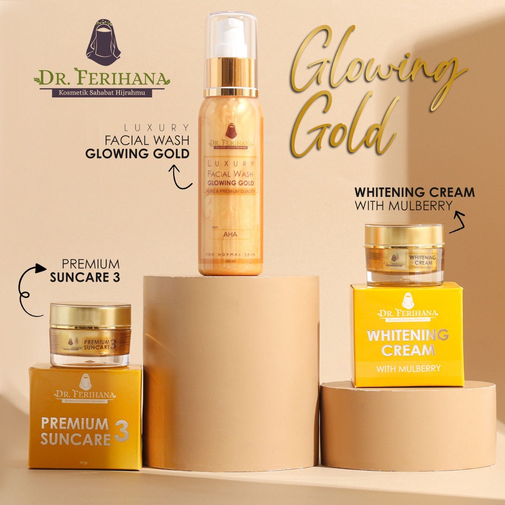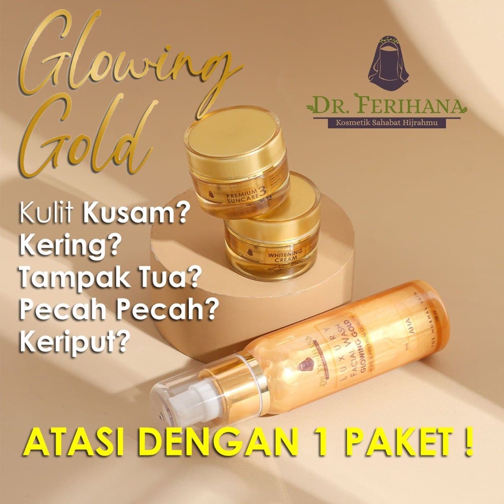 Paket Glowing Gold dr. Ferihana Cosmetics & Skincare Merupakan Paket Perawatan Wajah untuk Kulit Normal Kering Kombinasi yang Mampu Mencerahkan Memudarkan Flek Sekaligus Sebagai Anti Aging
