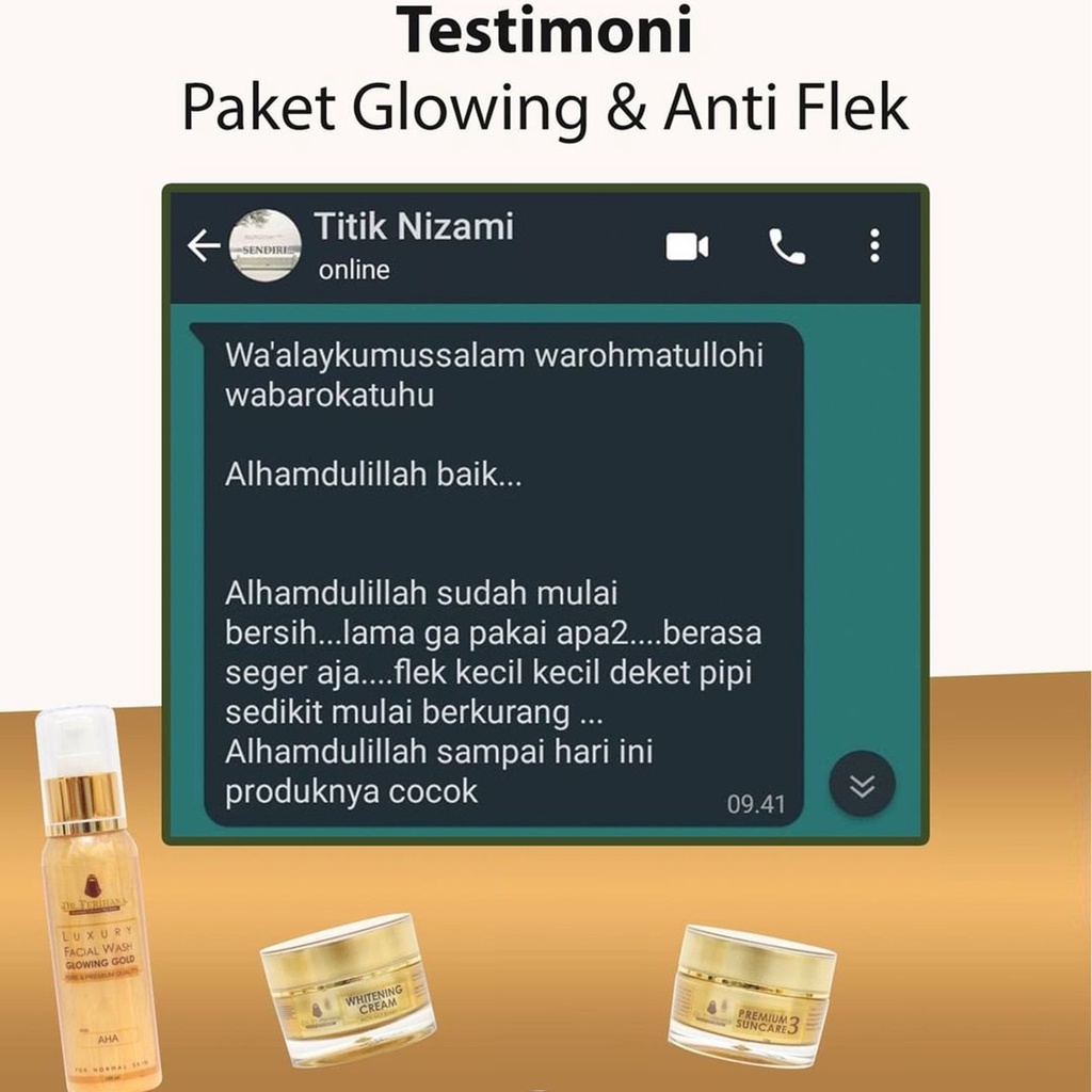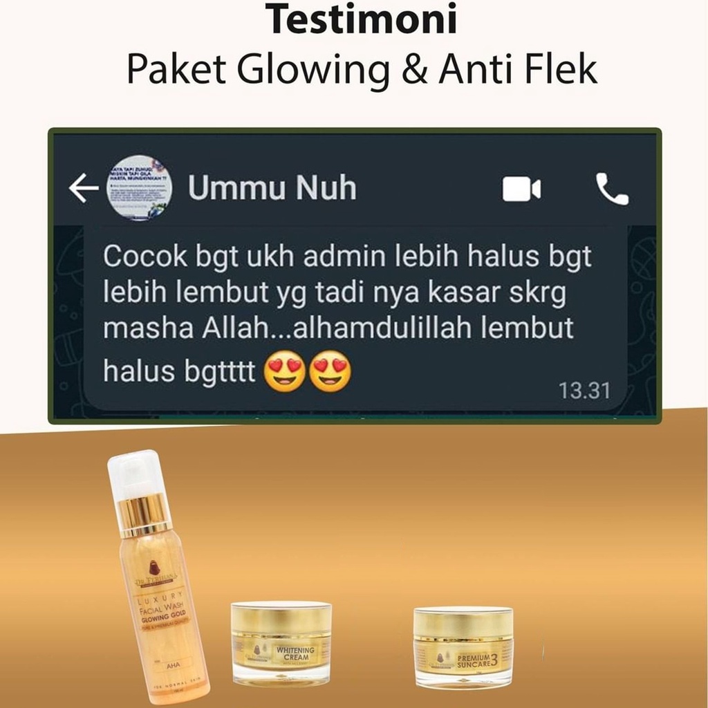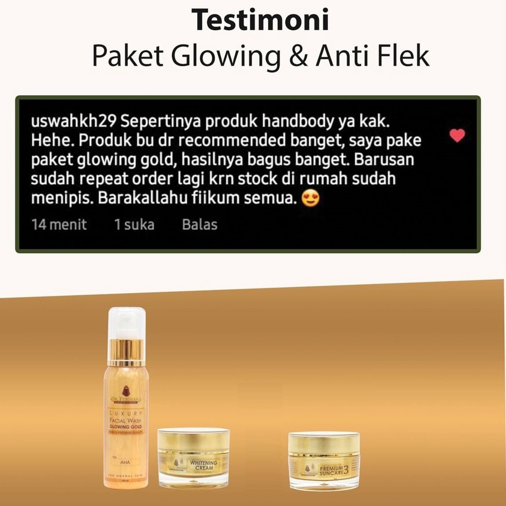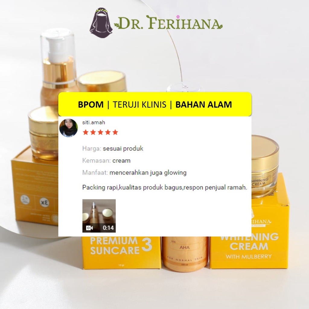 Paket Glowing Gold dr. Ferihana Cosmetics & Skincare Merupakan Paket Perawatan Wajah untuk Kulit Normal Kering Kombinasi yang Mampu Mencerahkan Memudarkan Flek Sekaligus Sebagai Anti Aging