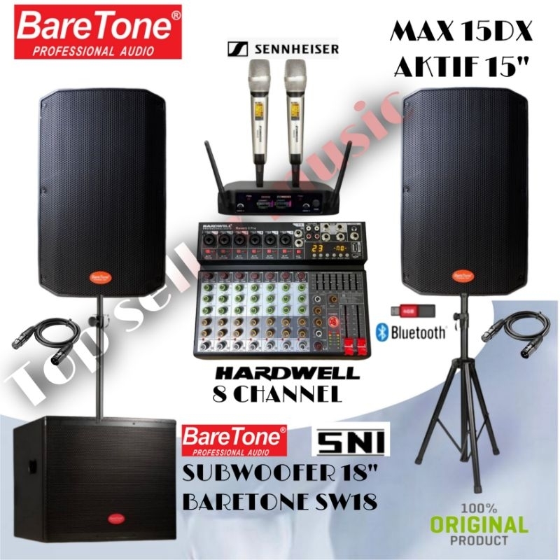 PAKET SOUND SYSTEM AKTIF 15" BARETONE MAX15DX MIXER 8 CHANNEL+SUBWOOFER 18 INCH 2MIC WIRELESS