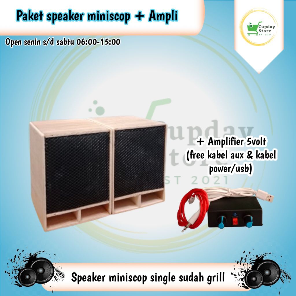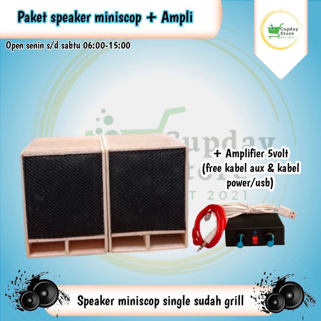 PAKET SPEAKER/SOUND SYSTEM + AMPLIFIER, SUARA GLEER,BOX MINISCOP 2INC SUDAH GRIL HITAM & POLOSAN