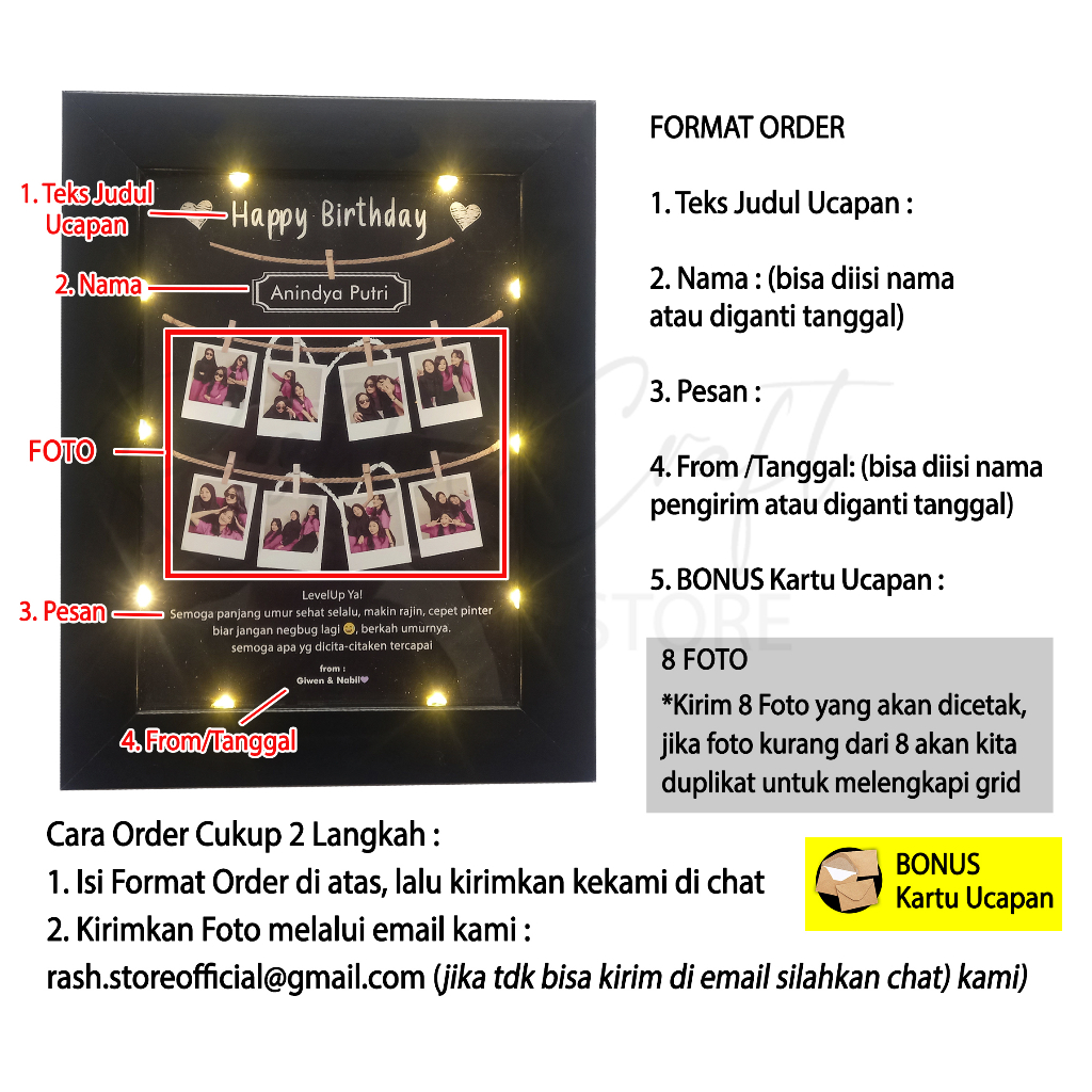 POLAROID FRAME LED | BONUS KARTU UCAPAN | 8 FOTO | GIFT FOR BIRTHDAY / GRADUATION /WEDDING / ANNIV / ETC