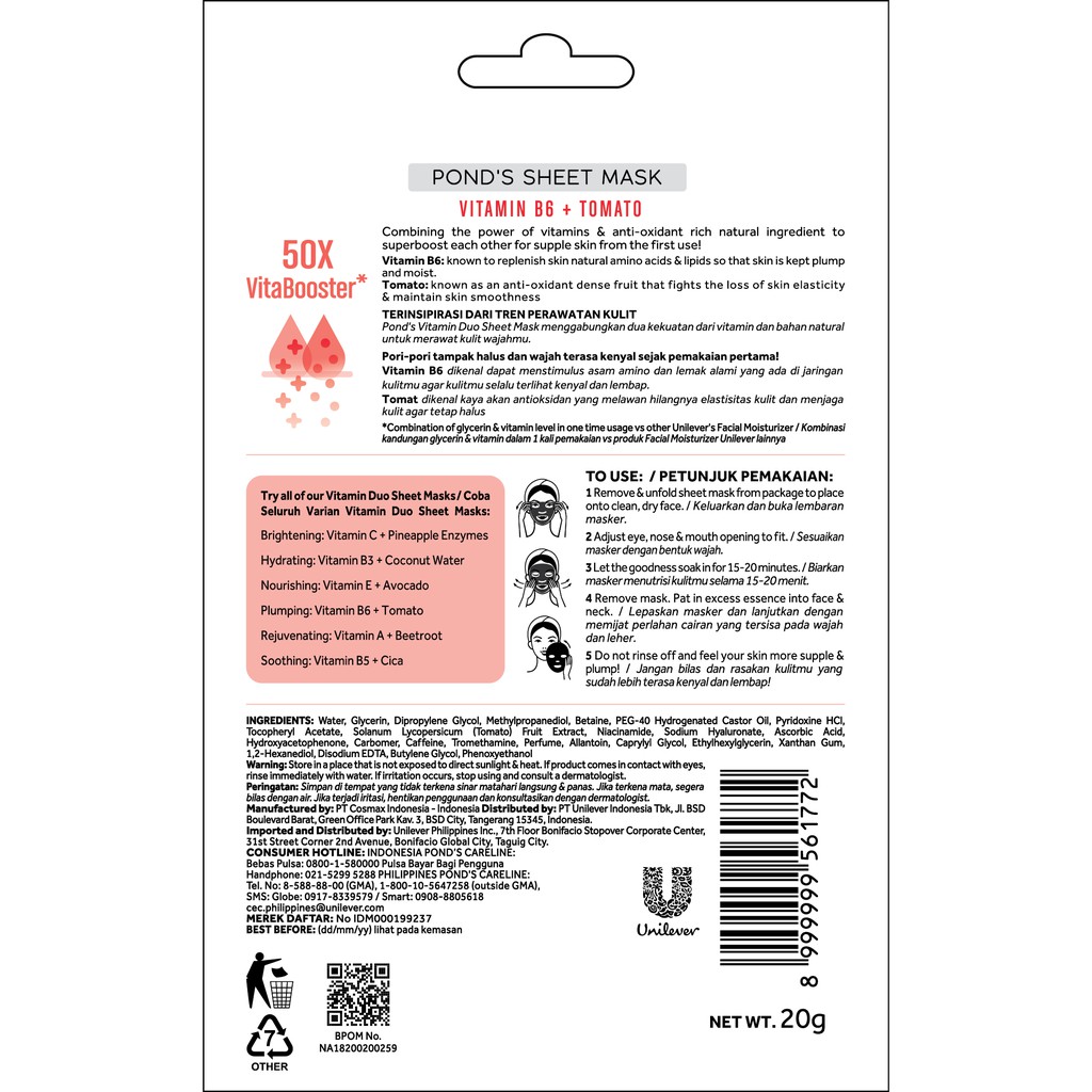 POND'S VITAMIN DUO SHEET MASK / MASKER WAJAH TOMAT + VIT B6 20G