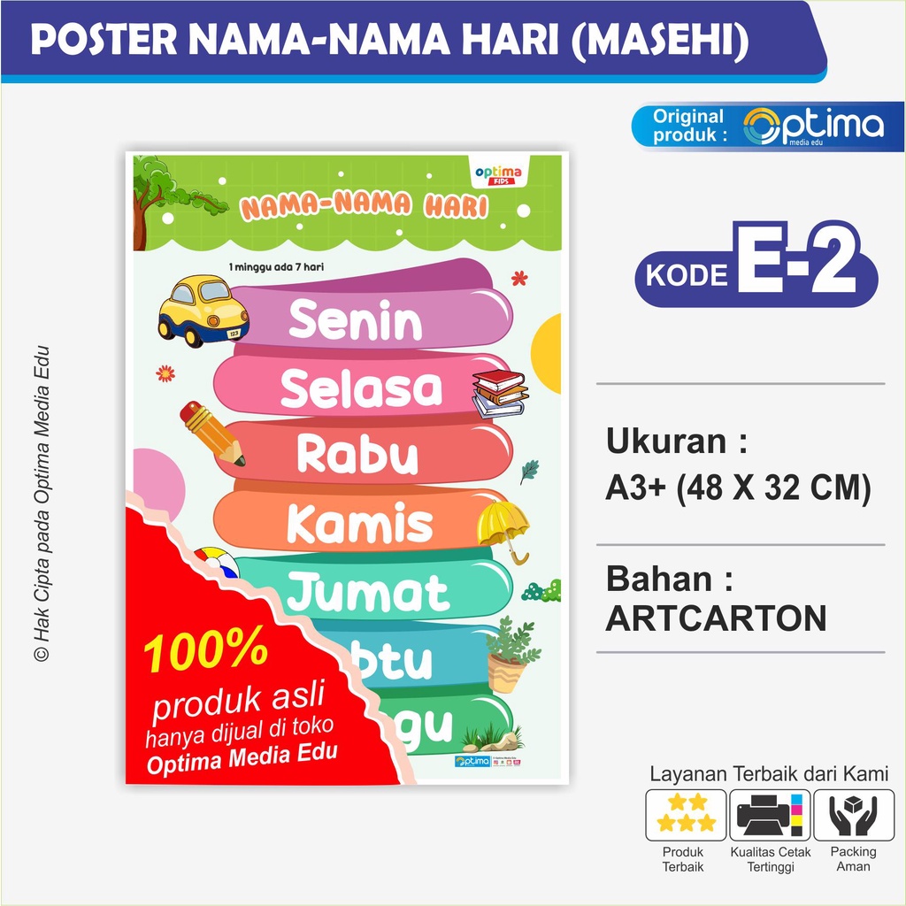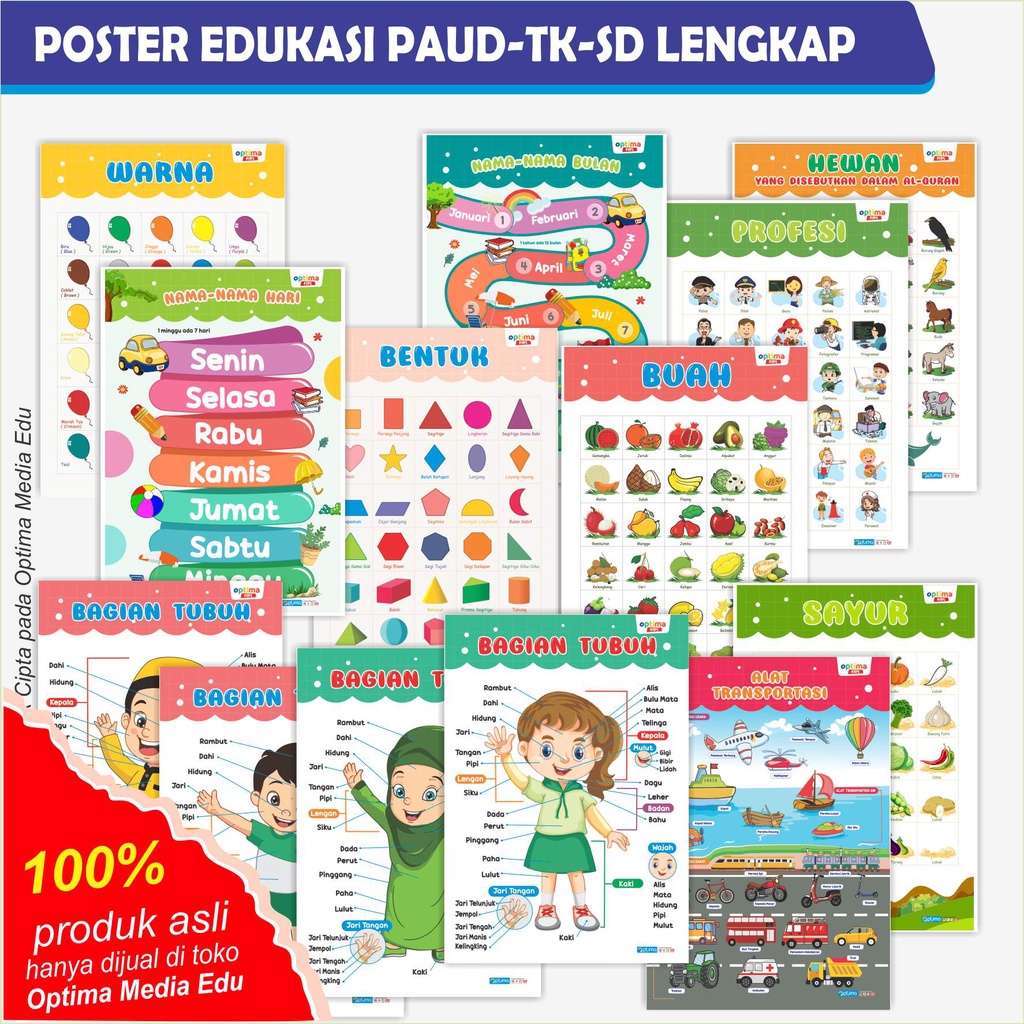 POSTER EDUKASI PAUD TK SD, NAMA BULAN, HARI, WARNA, TUBUH,SAYUR,BUAH,HEWAN,PROFESI,TRANSPORTASI