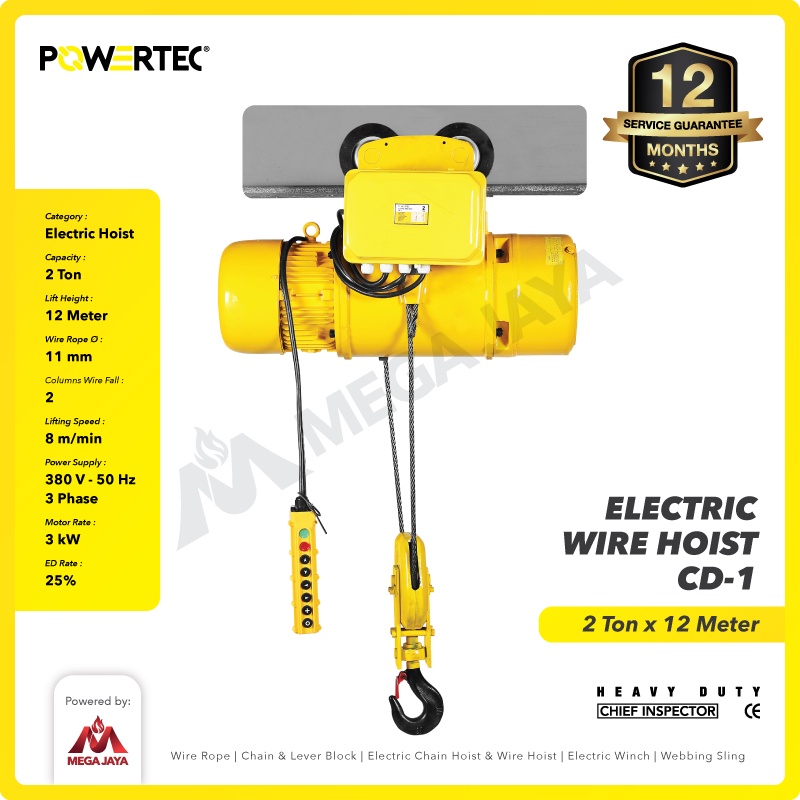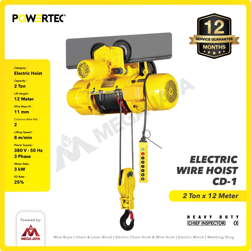 POWERTEC Electric Wire Rope Hoist 2 Ton x 12 Meter 3 Phase CD-1