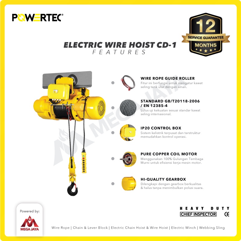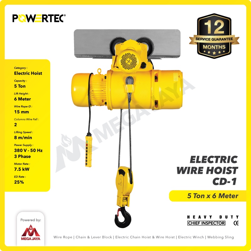 POWERTEC Electric Wire Rope Hoist 5 Ton x 6 Meter 3 Phase CD-1