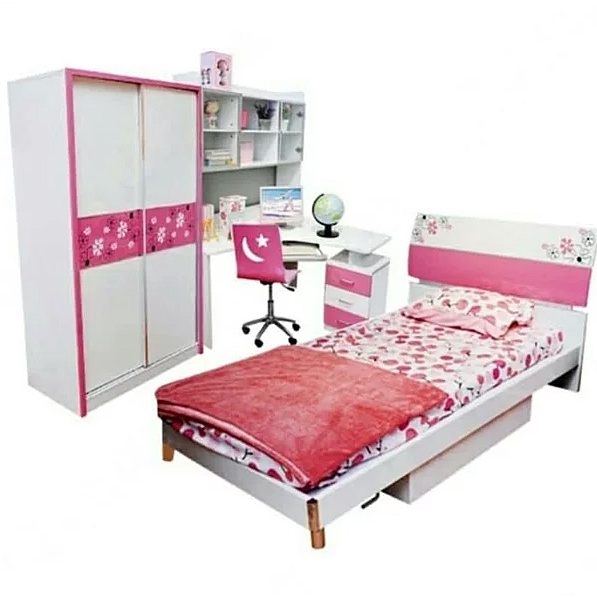 INFORMA Preloved Bed Set Pink Tempat Tidur Anak Perempuan All In Ranjang, Kasur, Nakas, Meja Belajar, Kursi, Lemari Baju