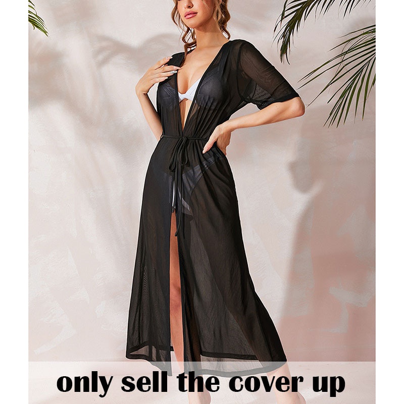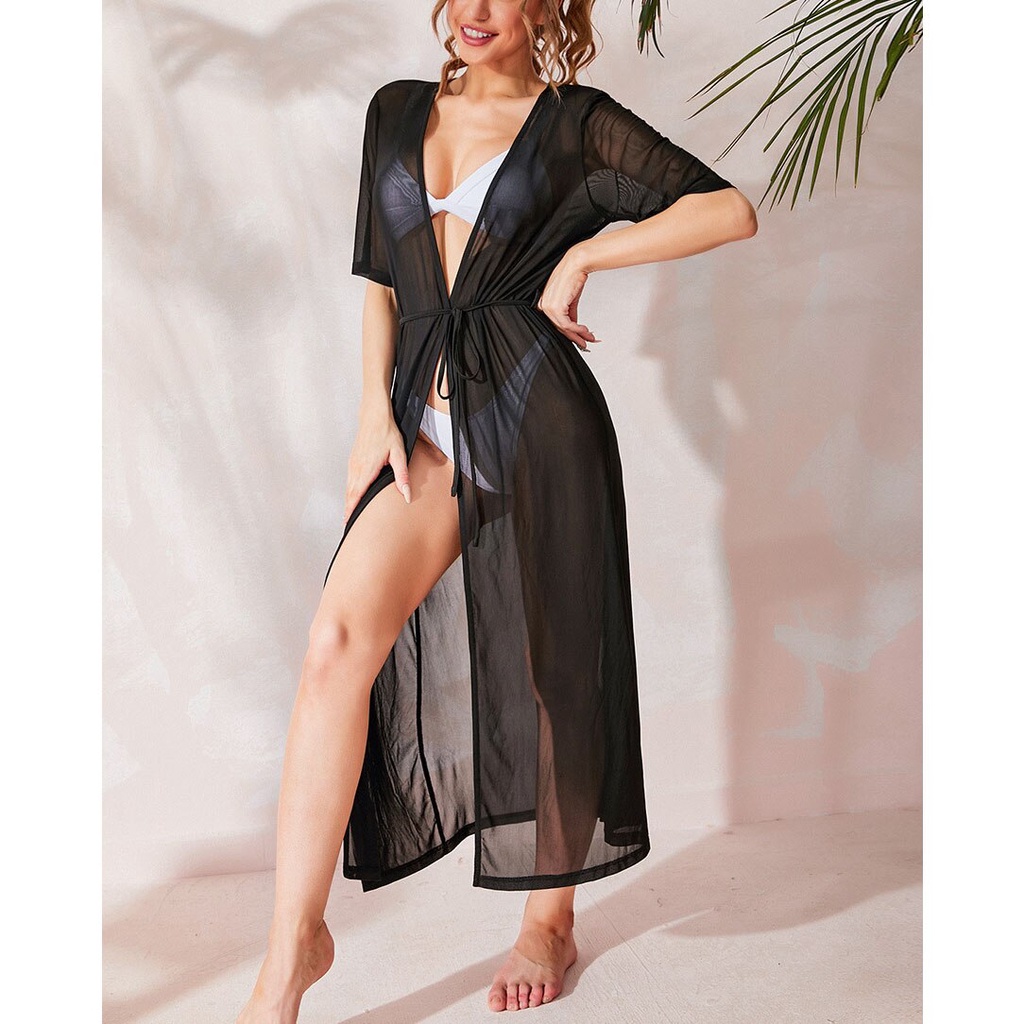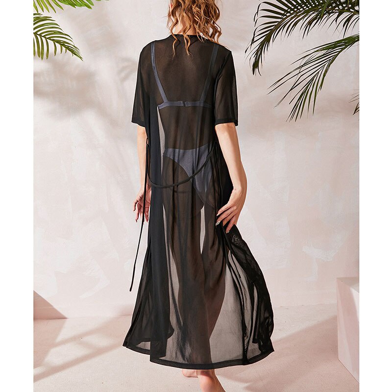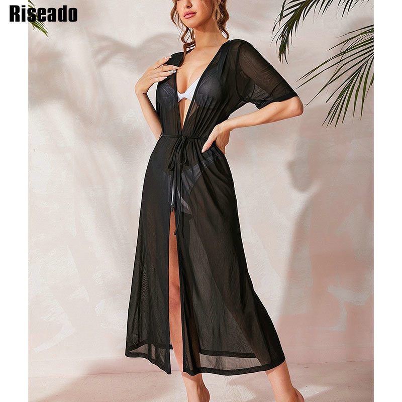 PREORDER Riseado Gaun Panjang Menutup Pantai Seksi Hitam Jaring Baju Renang Pantai Wanita Jaring Pakaian Pantai Tunik Bersabuk Setengah Lengan Stopkontak Mandi Pareo
