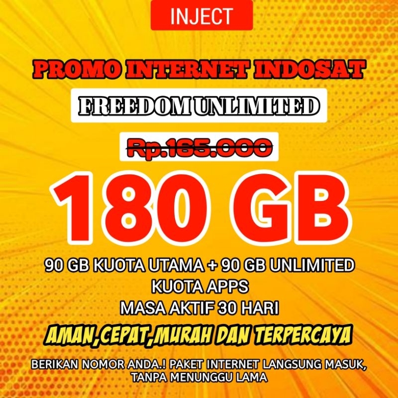 PROMO INTERNET INDOSAT - FREEDOM UNLIMITED 180GB KUOTA UTAMA 90GB + UNLIMITED APPS HINGGA 90GB MASA AKTIF 30 HARI