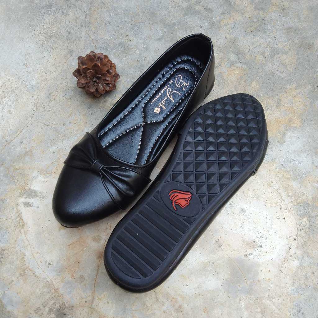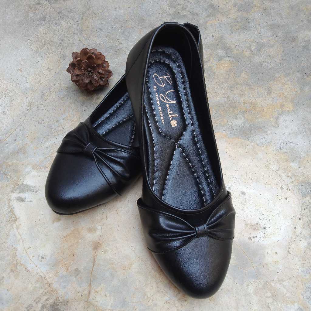 PROMO Sepatu Flat Wanita Sol Karet Flatshoes Cewek Kuliah Kerja Hitam Pita BYouth CL05