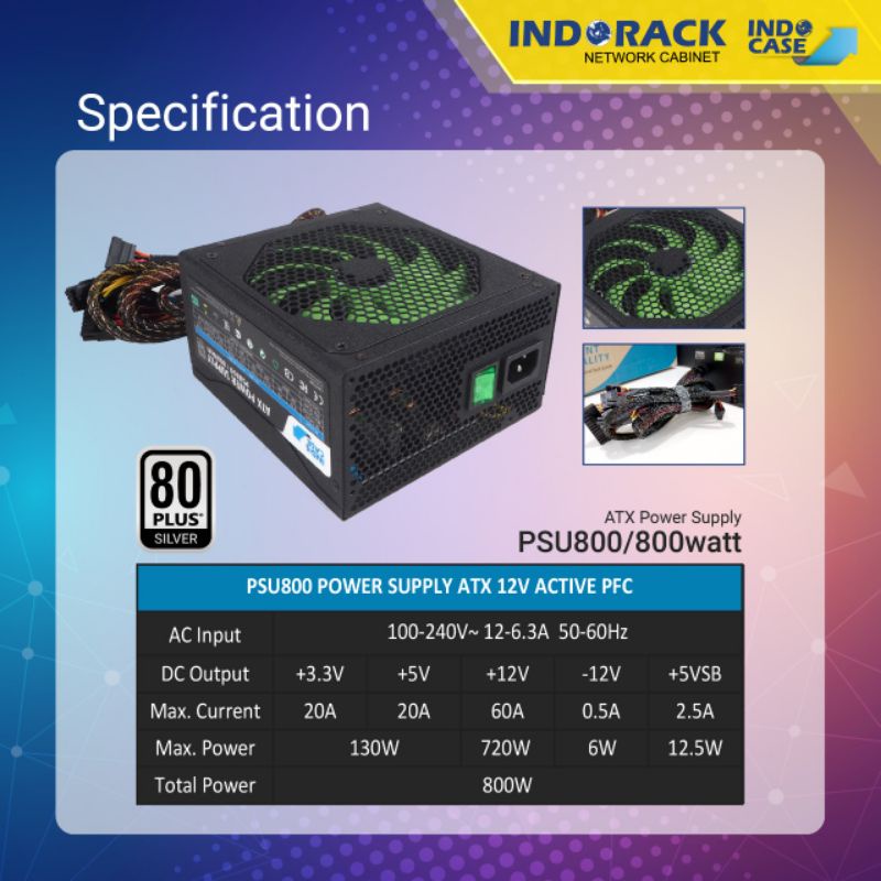 PSU800 800W 80+ SILVER INDOCASE ATX Power Supply PSU 800 Watt with Modular Cable