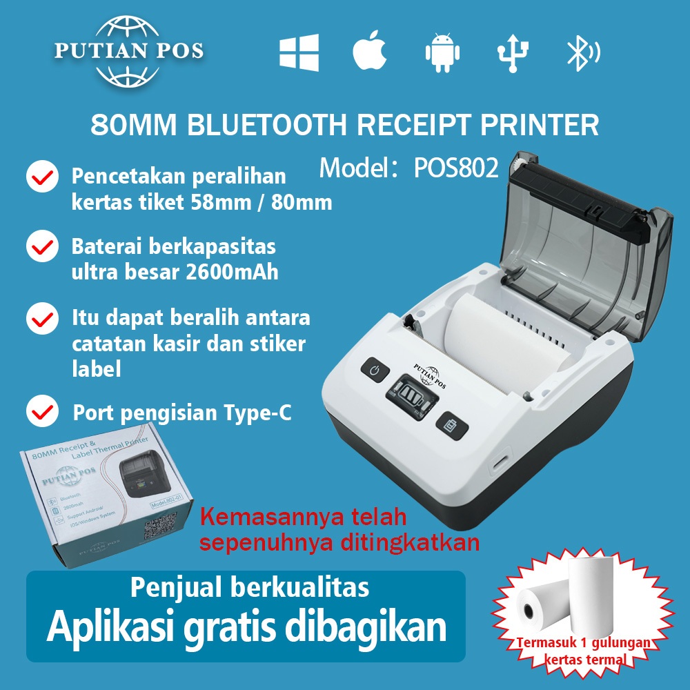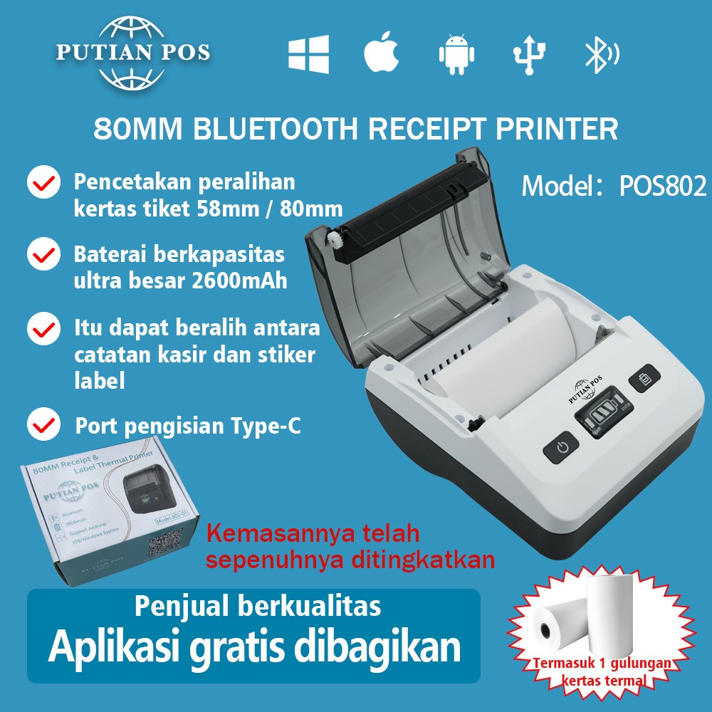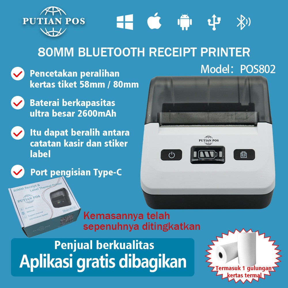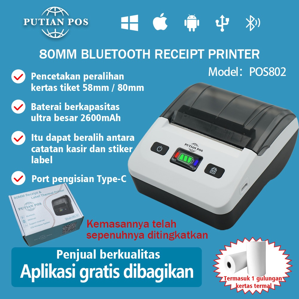 Printer Thermal 80MM Bluetooth + USB Cetak Resi Alamat Kasir Nota PPOB POS Barcode Support Kertas /android/ios/Windows /free* 1 Roll
