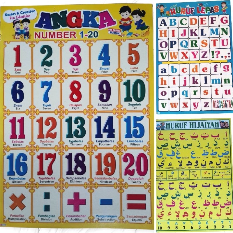Paket 3 Poster Edukasi / Angka 1 - 20 / Hurup Lepas / Hurup Hijaiyah