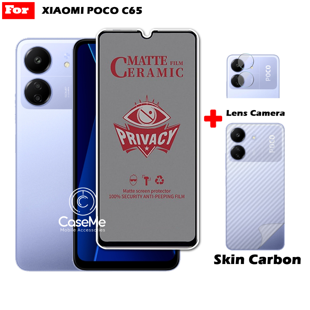 Paket 3in1 Anti Gores Layar Privacy Xiaomi Poco C65 C40 C3 Free Tempered Glass Camera dan Skin Carbon