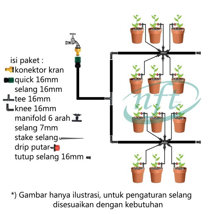 Paket Drip Irigasi 12 Titik Selang 16mm Tipe Kran Drat