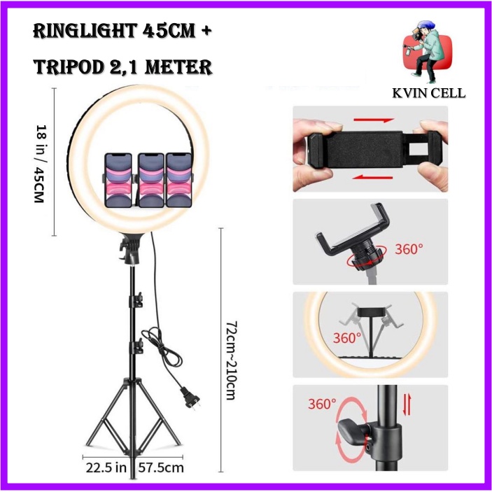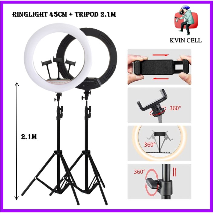 Paket Ring light 45cm / Ring light Besar / Ring light Jumbo / Ring light 45cm / Ring light 45 CM / Ring light 45cm Murah / Ring light 45cm Lengkap / Ring light 45cm + Light Stand Tripod 2M 2.1 Meter / Make Up Live Streaming Touch Sentuh Lampu 45cm