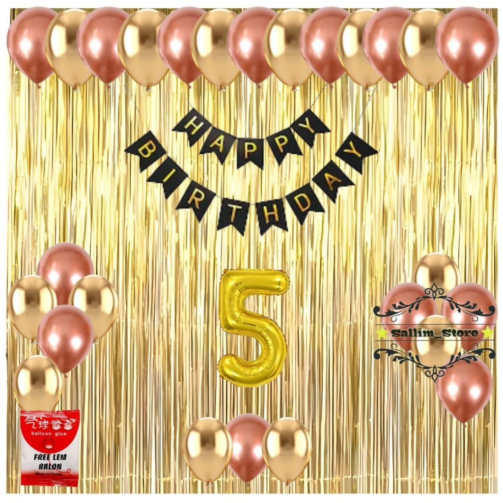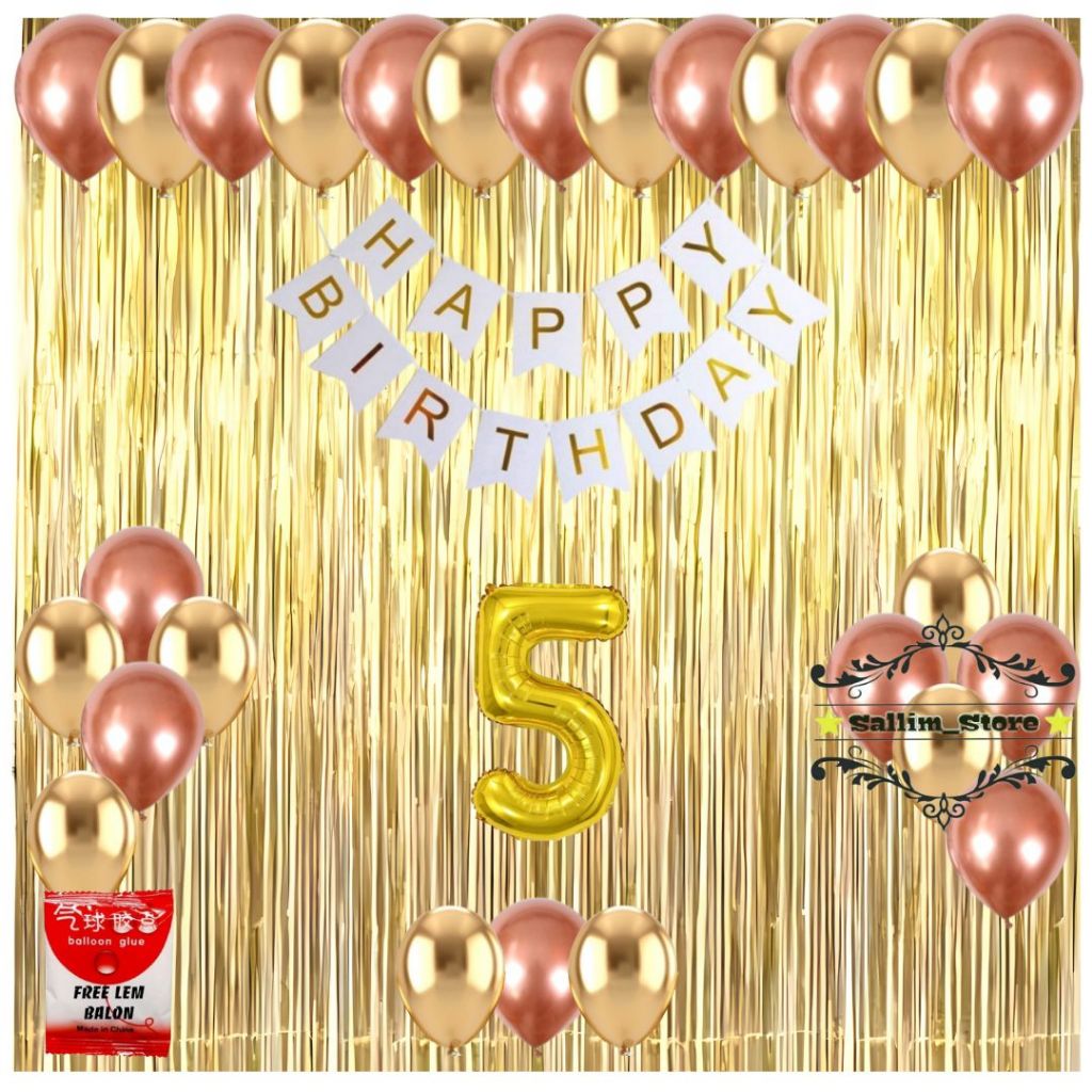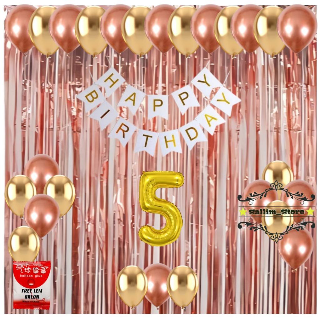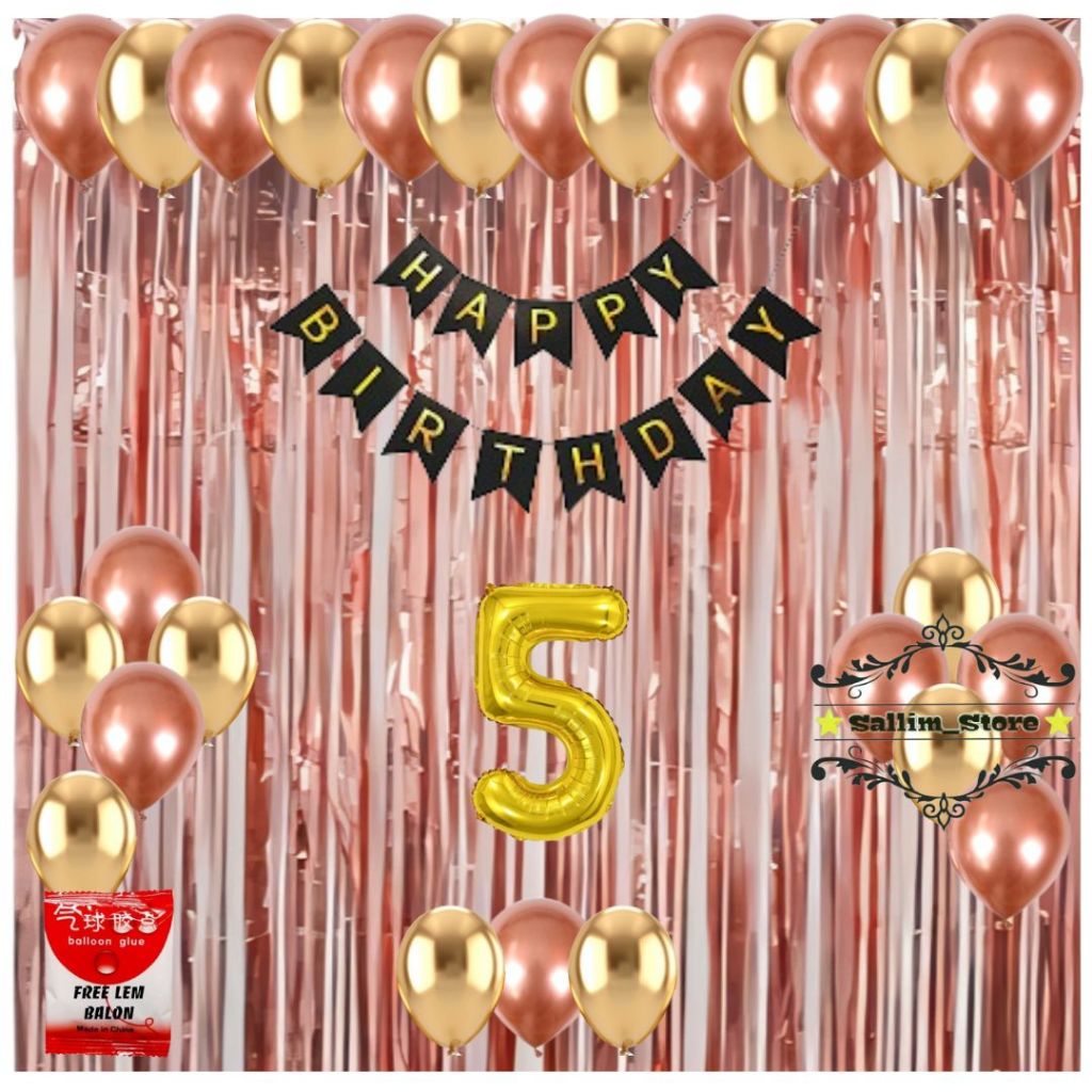 Paket Set Dekorasi Pesta Ulang Tahun Anak Banner Happy Birthday Balon Rosegold Gold Tirai Foil Ultah