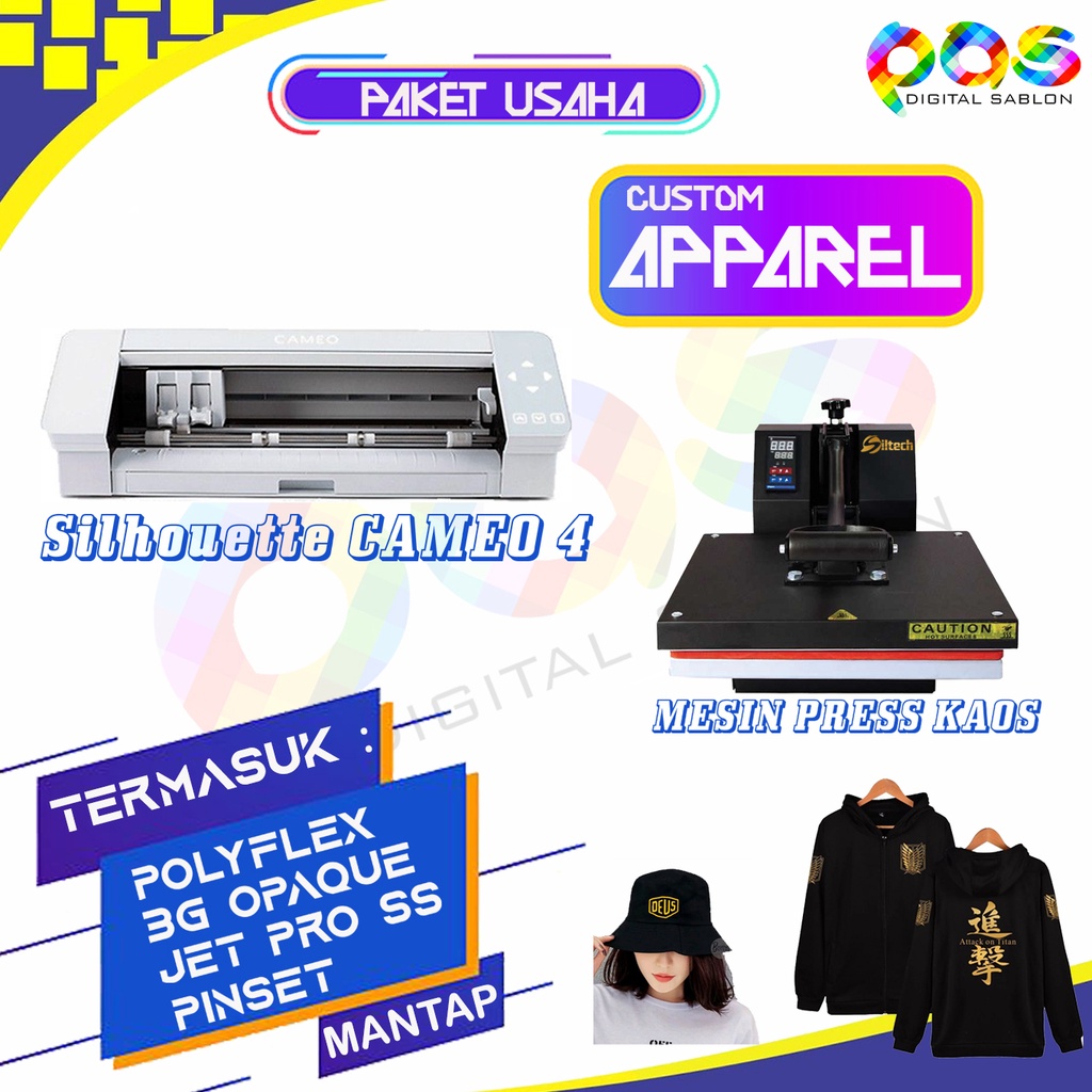 Paket Usaha Cetak Baju /Kaos (Mesin cutting Cameo4, mesin press Baju dan bahan baku)