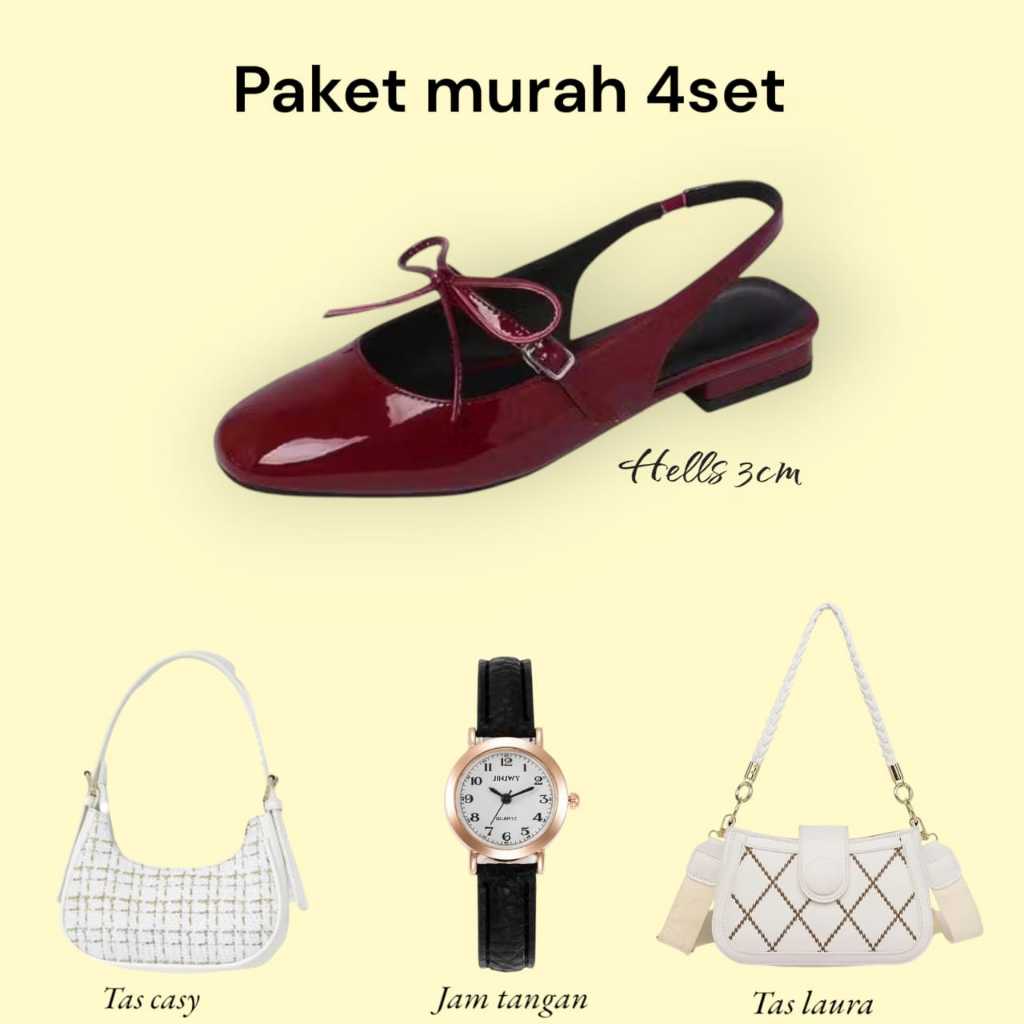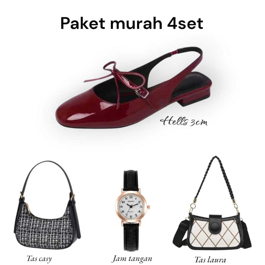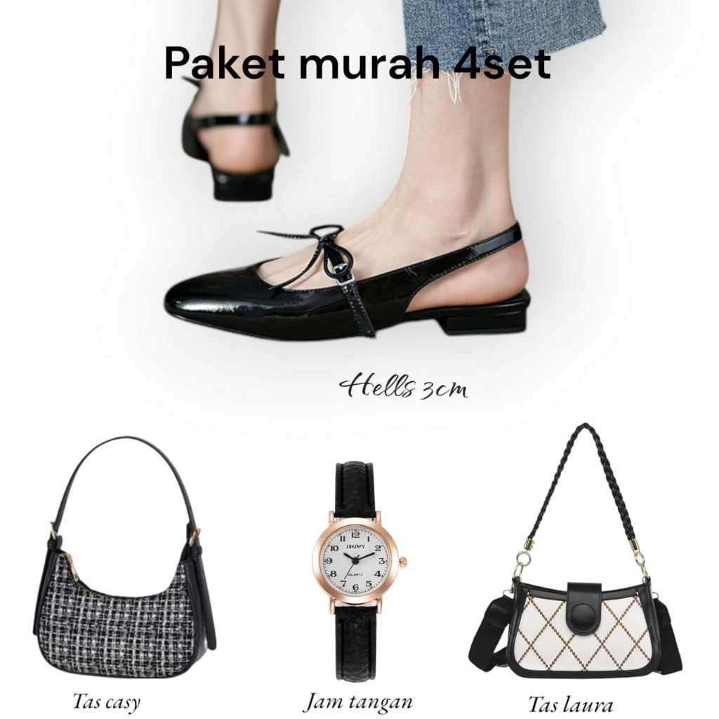 Paket bandling hemat 4 set hak3cm zeni+jam+tas laura+tas casy