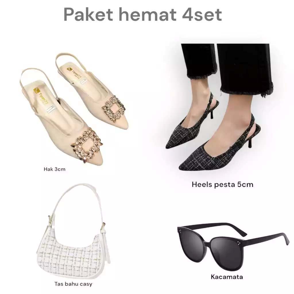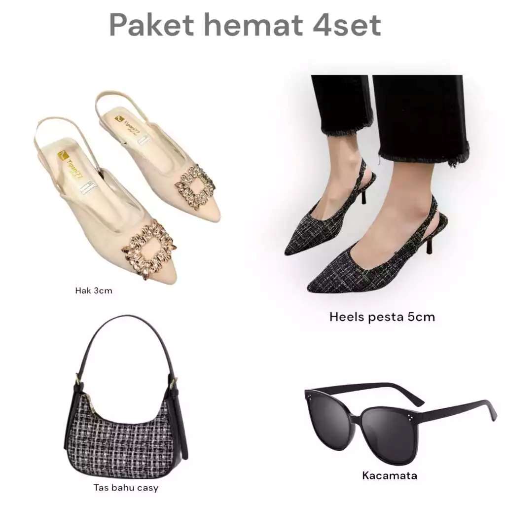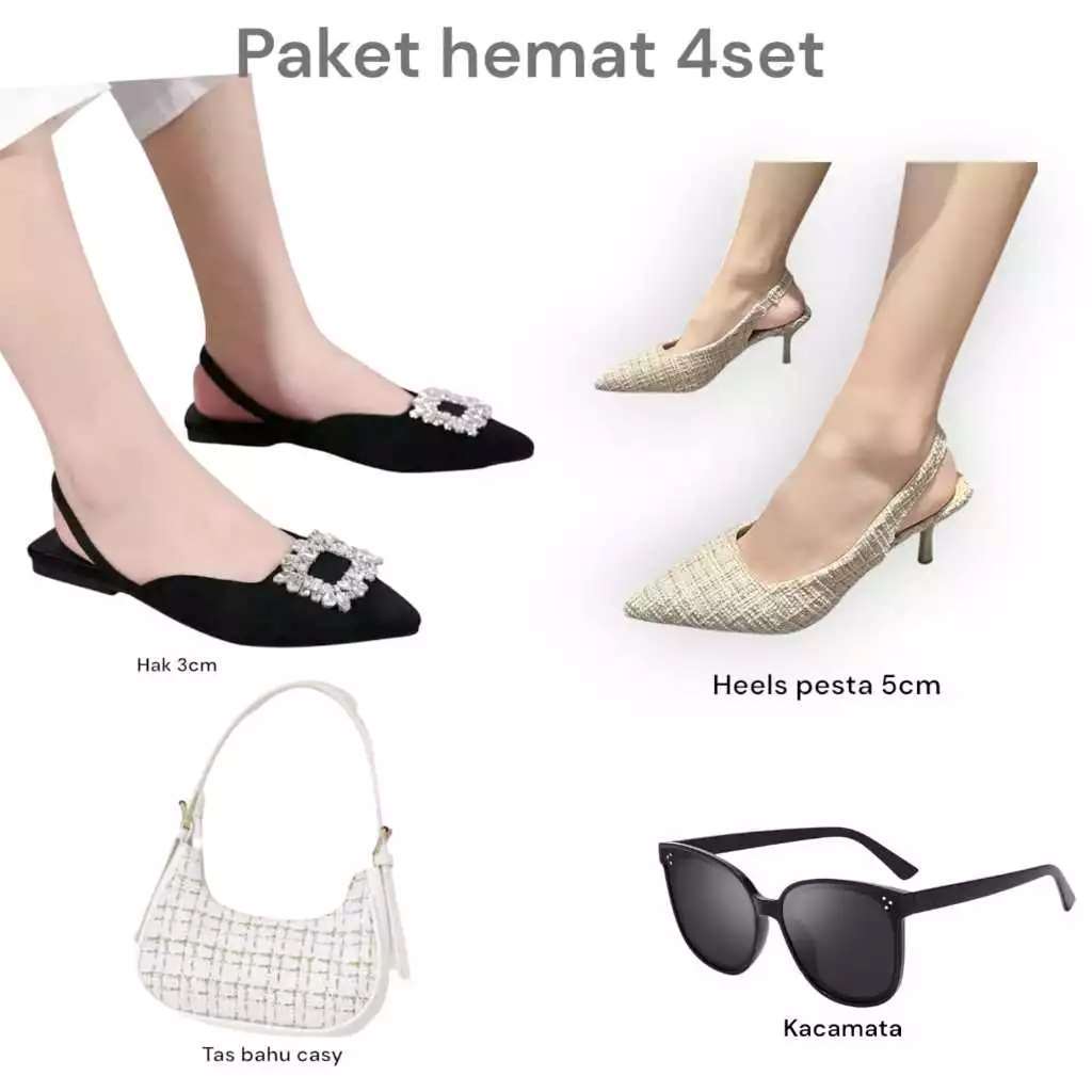 Paket hemat 4 set kacamata+tas casy+lavista+heels pesta kobe