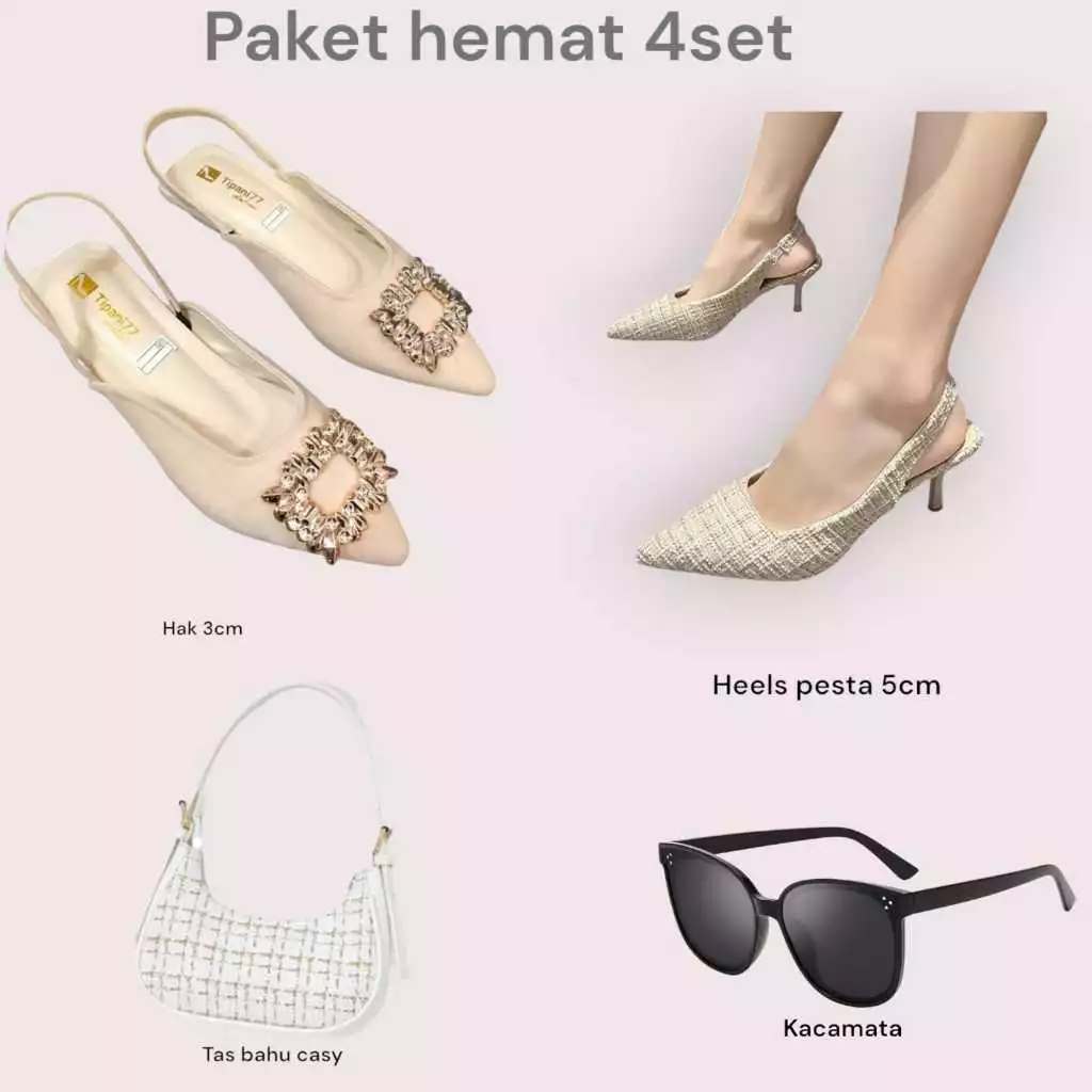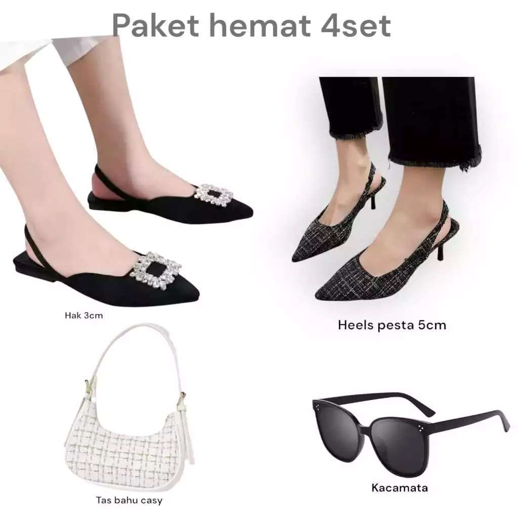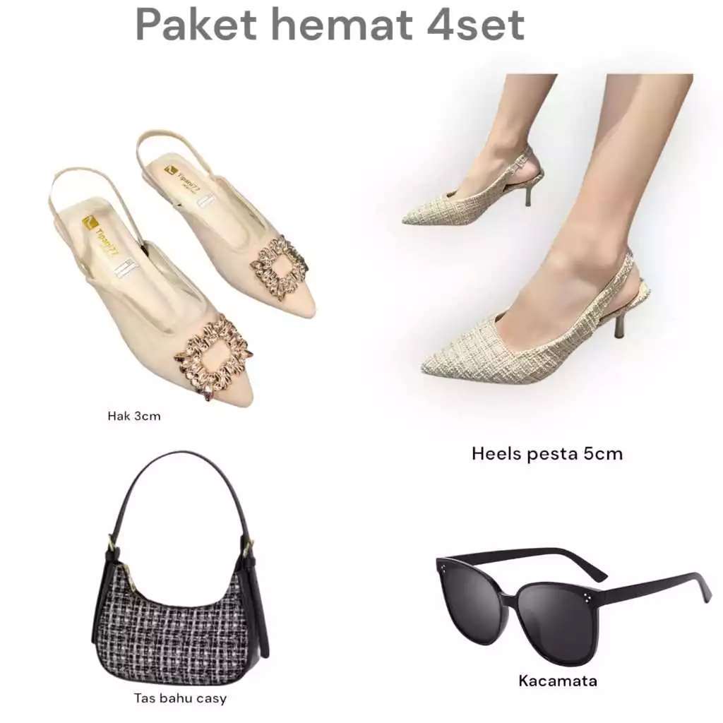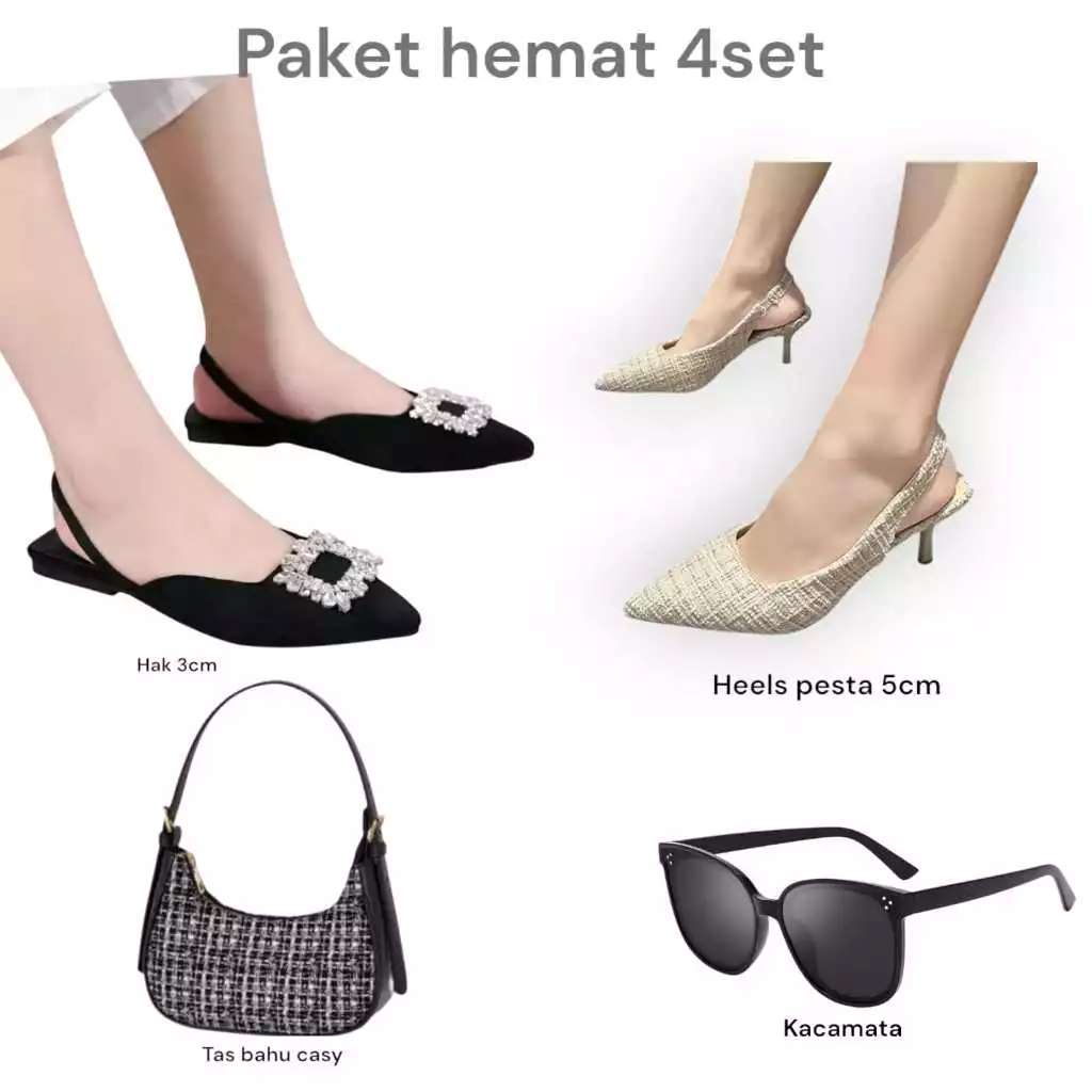 Paket hemat 4 set kacamata+tas casy+lavista+heels pesta kobe