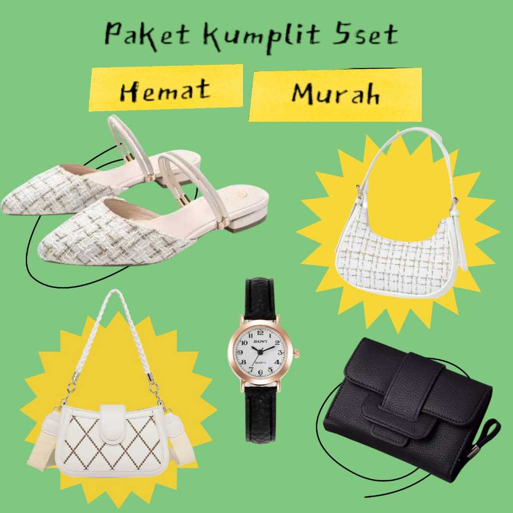 Paket kumplit 5 set sandal haktahu vina+jam+tas casy+tas laura+dompet