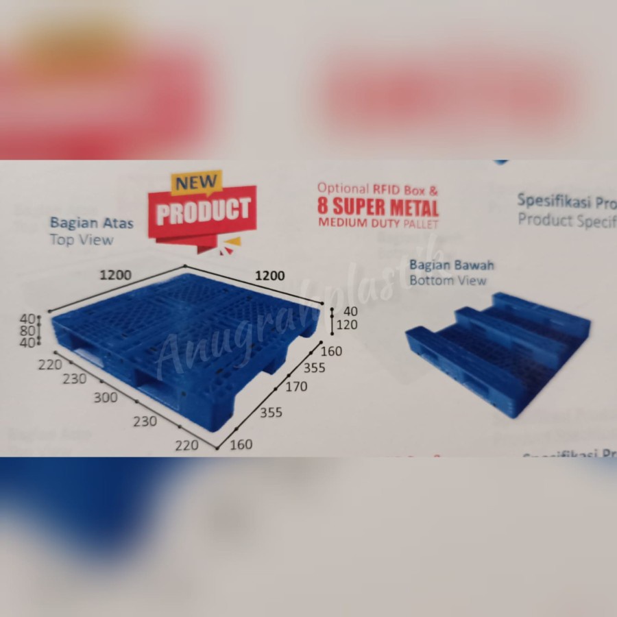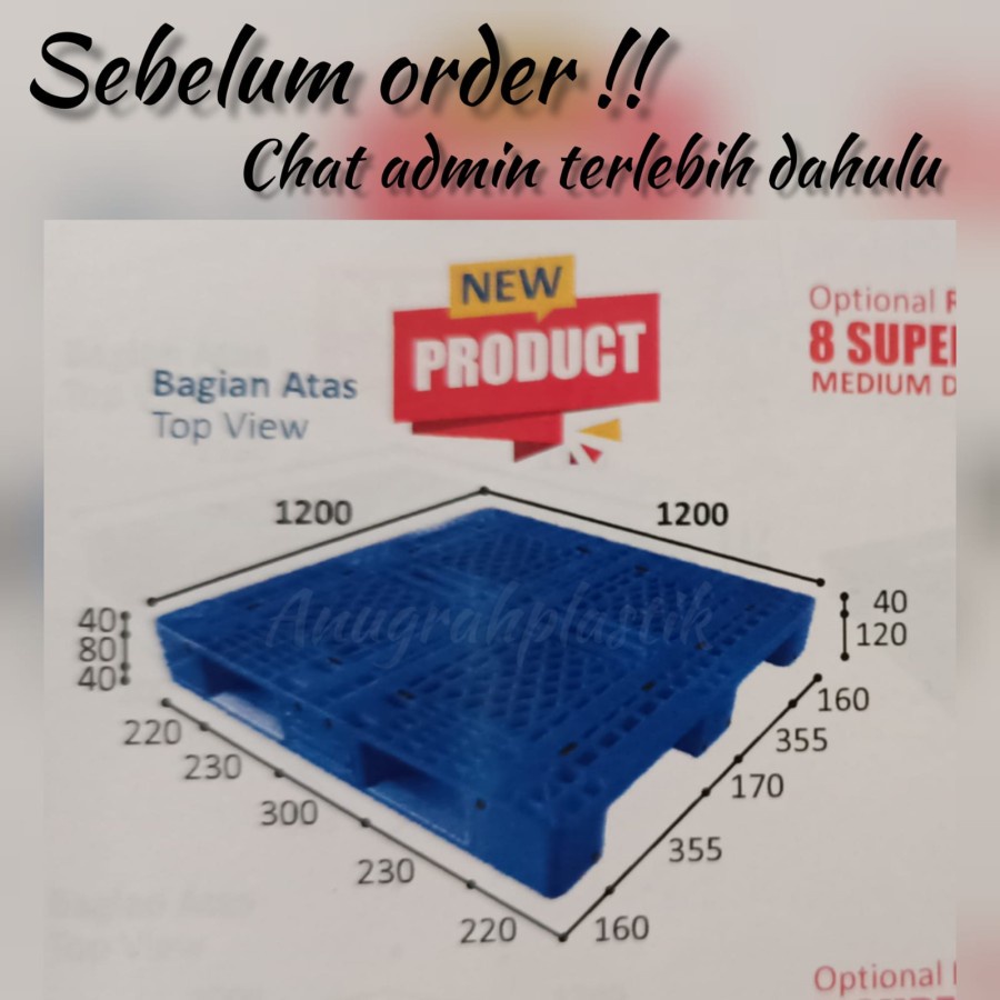 Pallet Plastik Baru (NEW) warna BIRU MQ uk 120 x 120 x 16 cm alas beban Static, Dinamic & Rak ( warna Biru)