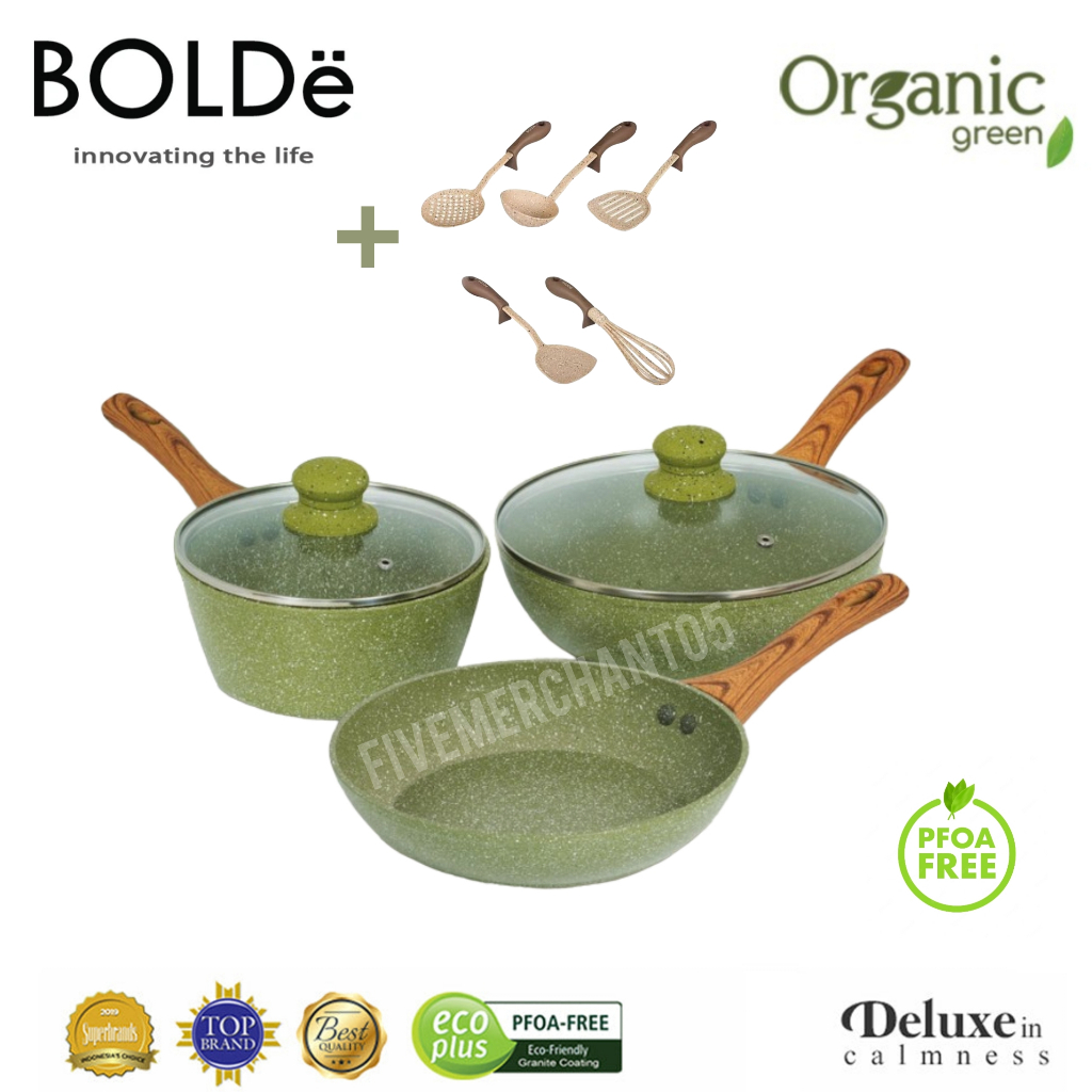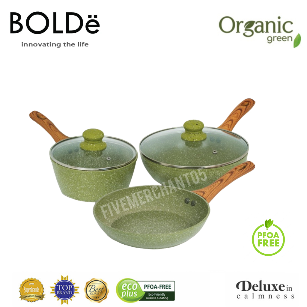 Panci Set Bolde Organic Green Pan Set 5 pcs Wok Pan Sauce Pan Fry Pan Hijau Tutup Kaca Lid PFOA Free