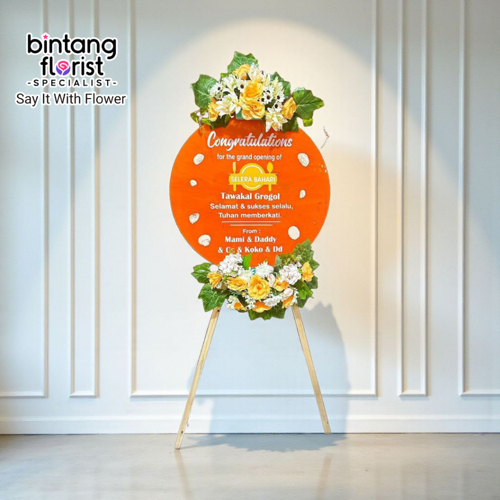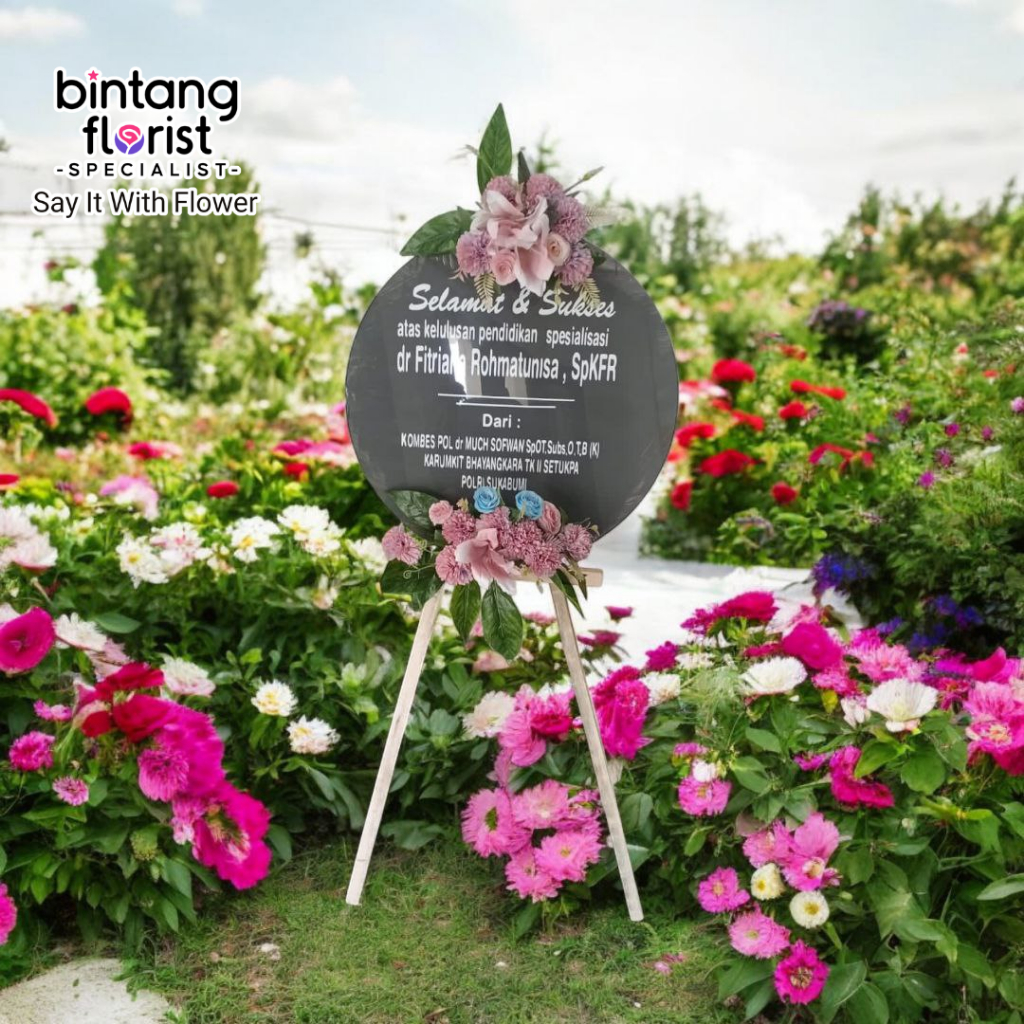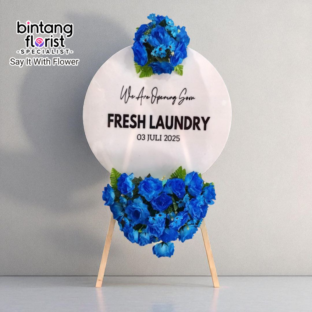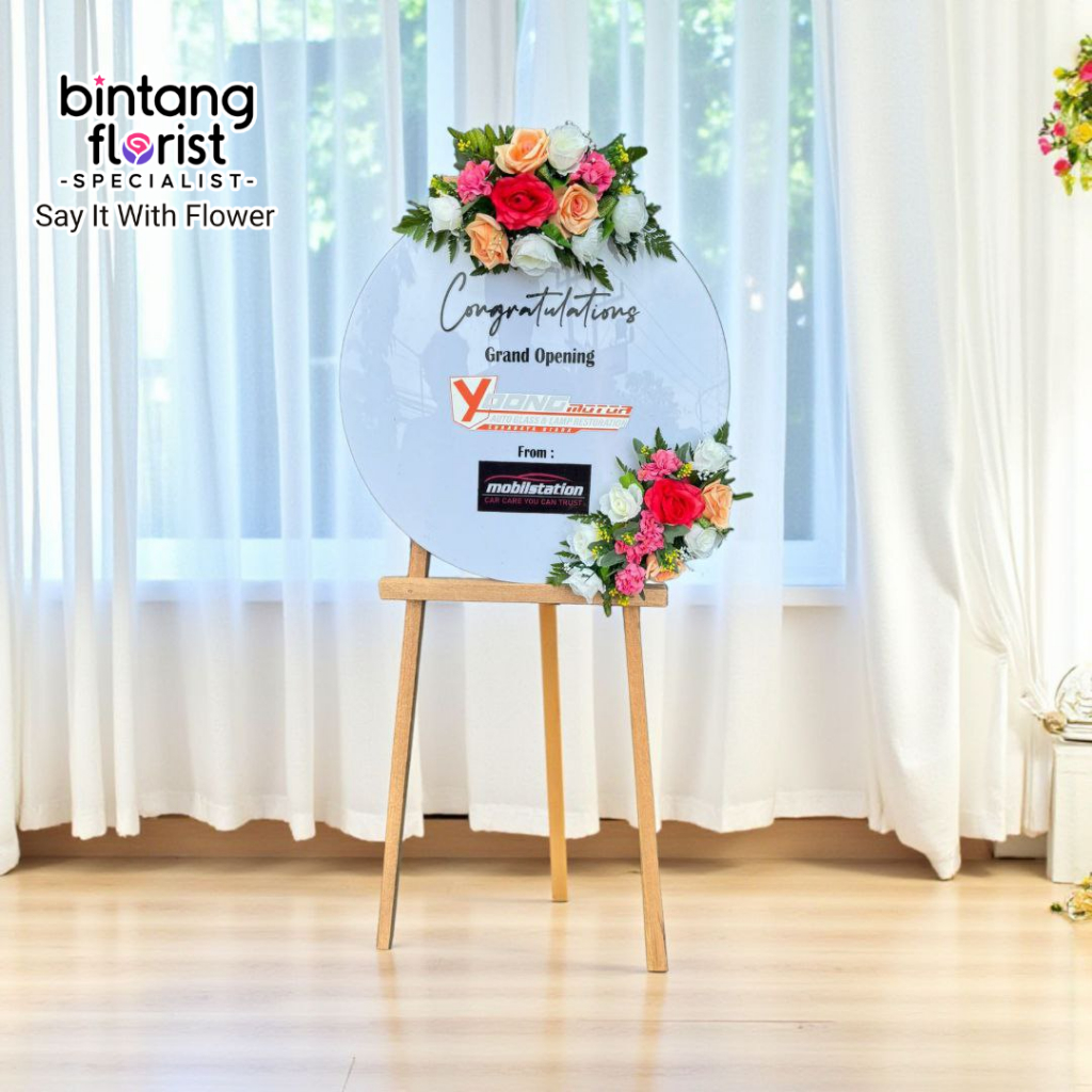 Papan Akrilik Bulat Diameter 70 cm dengan Bunga Artificial 2 Titik untuk Grand Opening, Wedding, Inauguration, dan Acara Resmi | Bintang Florist Jakarta