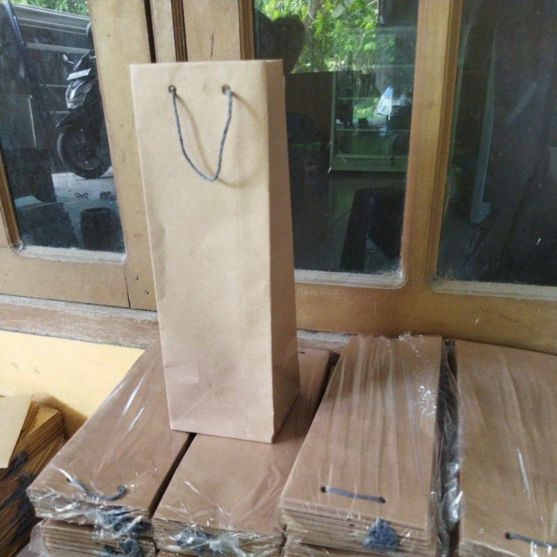 Paper Bag Botol Panjang Tali Rami Custom Tas Kertas Craf Coklat Buat Tempat Botol Ukuran 10x30