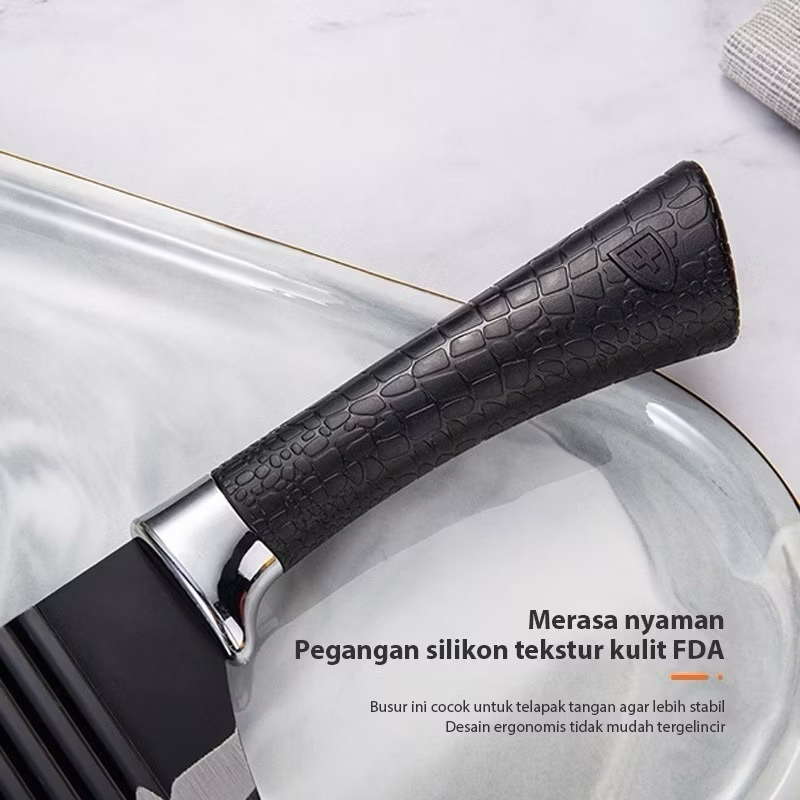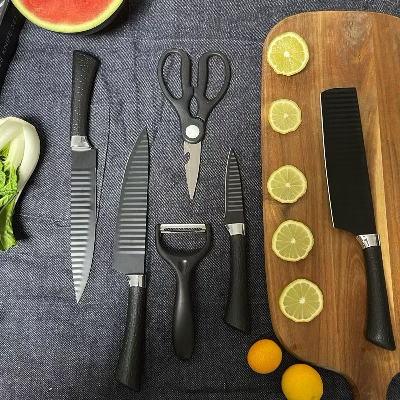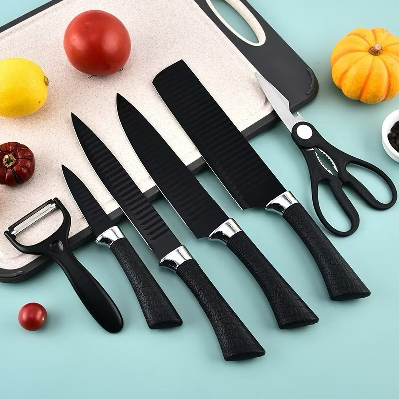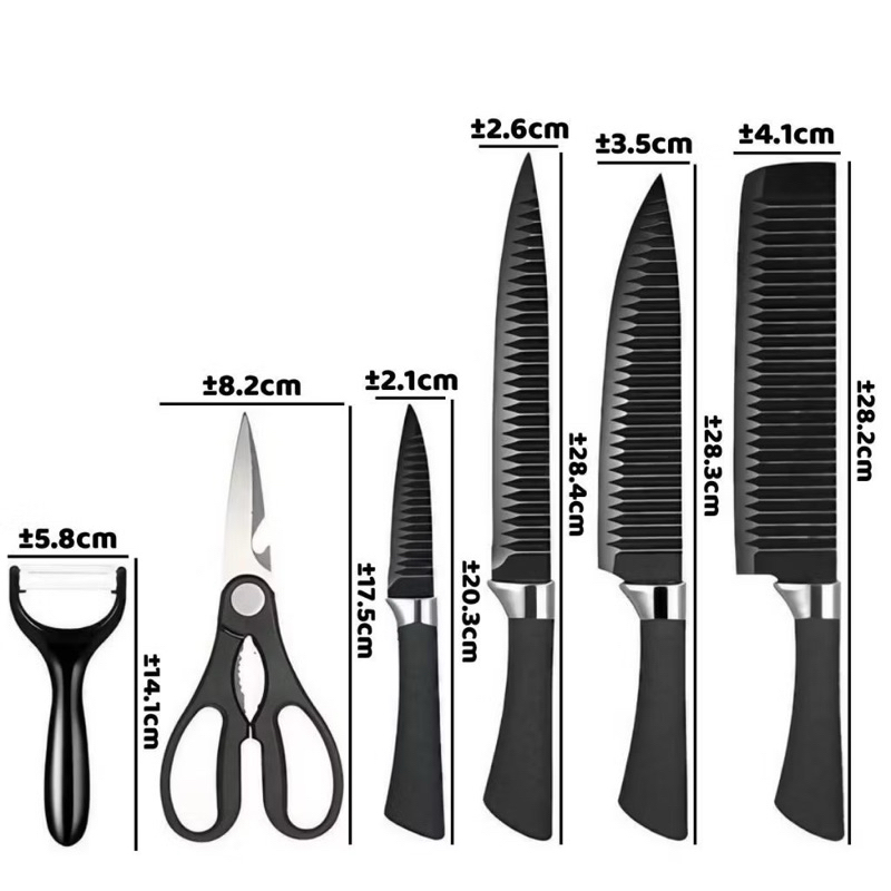 Pi (BLACK)Pisau Dapur Set 6 Pcs Bahan Stainless Steel Anti Lengket Warna Hitam Non Slip / Black Kitchen Knife 6 in 1 Gunting Peeler Piso Daging