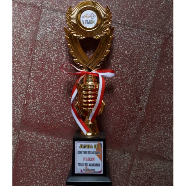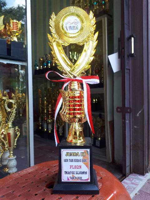Piala Trophy penghargaan lomba juara set free custom pita dan papan nama + logo atas