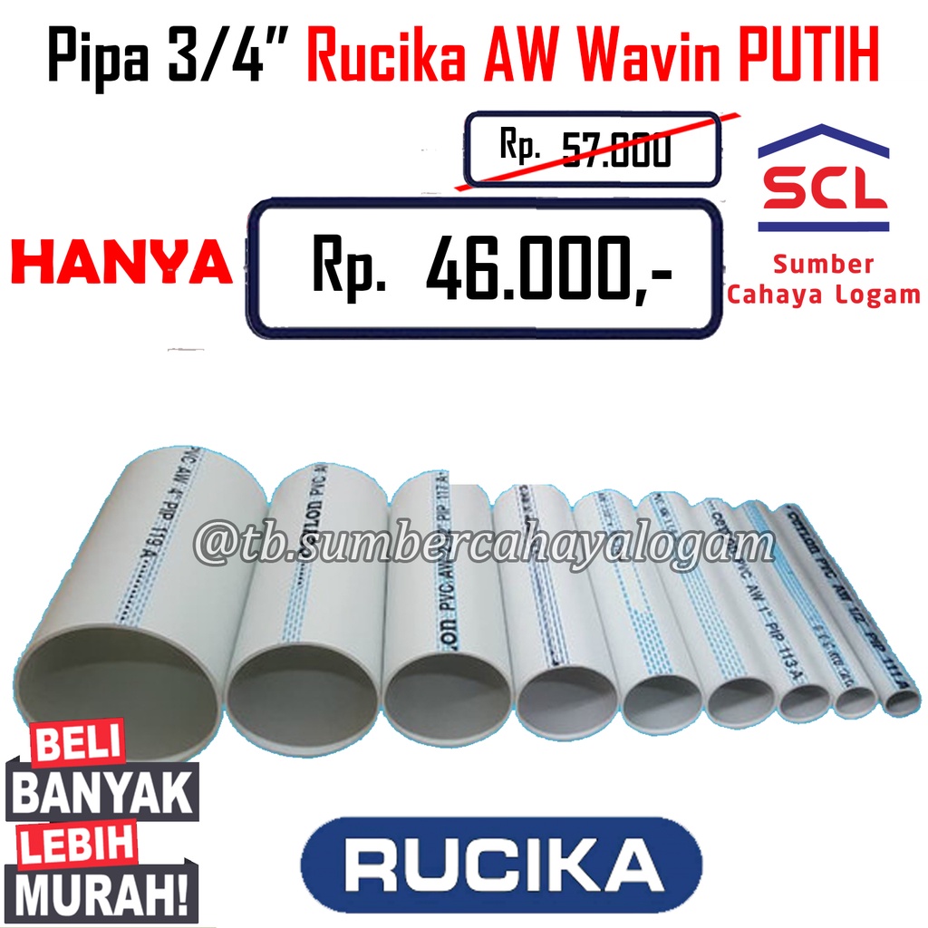 Pipa PVC Paralon 3/4" Inch 3 per 4 inchi in Wavin Rucika AW 4 Meter SERBAGUNA TEBAL ANTI PATAH PECAH RETAK TAHAN CUACA PANAS DINGIN ASAM ORIGINAL PRODUK RYUCIKA